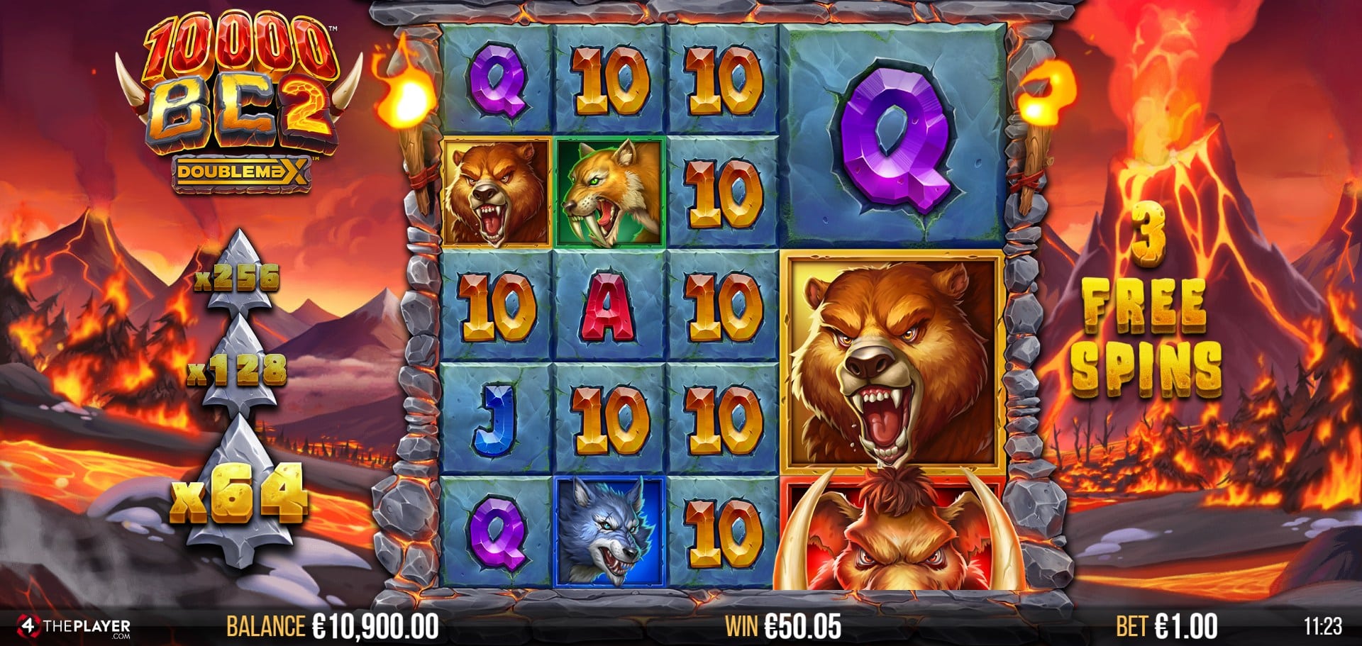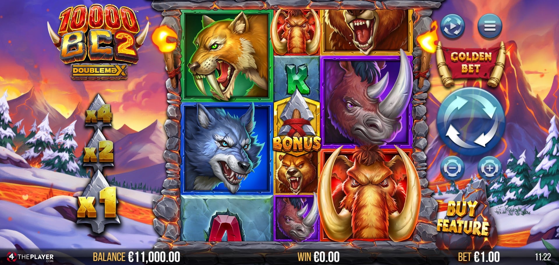 Visually, 10,000 BC 2 DoubleMax is one of 4ThePlayer’s most ambitious slots to date. The clash of snow and fire gives the game an intense cinematic quality. The 5×5 reel grid is framed by primitive stone columns, with animated details like bubbling lava and erupting volcanoes creating a sense of imminent danger.