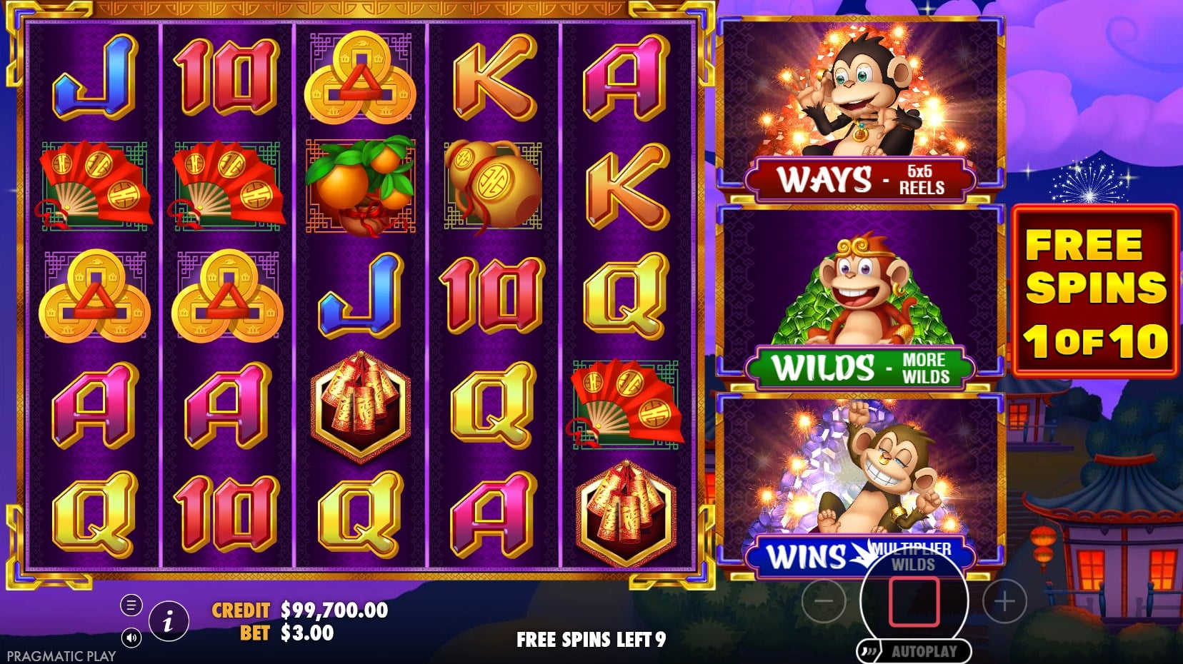 The slot’s excitement centers on its Free Spins feature, triggered probabilistically when one or more Gem Symbols (red, green, or blue) land on the reels. Each Gem awards 5 free spins, allowing for up to 15 spins if all three land simultaneously. These Gems are tied to the three monkeys flanking the reels, each activating a unique modifier: