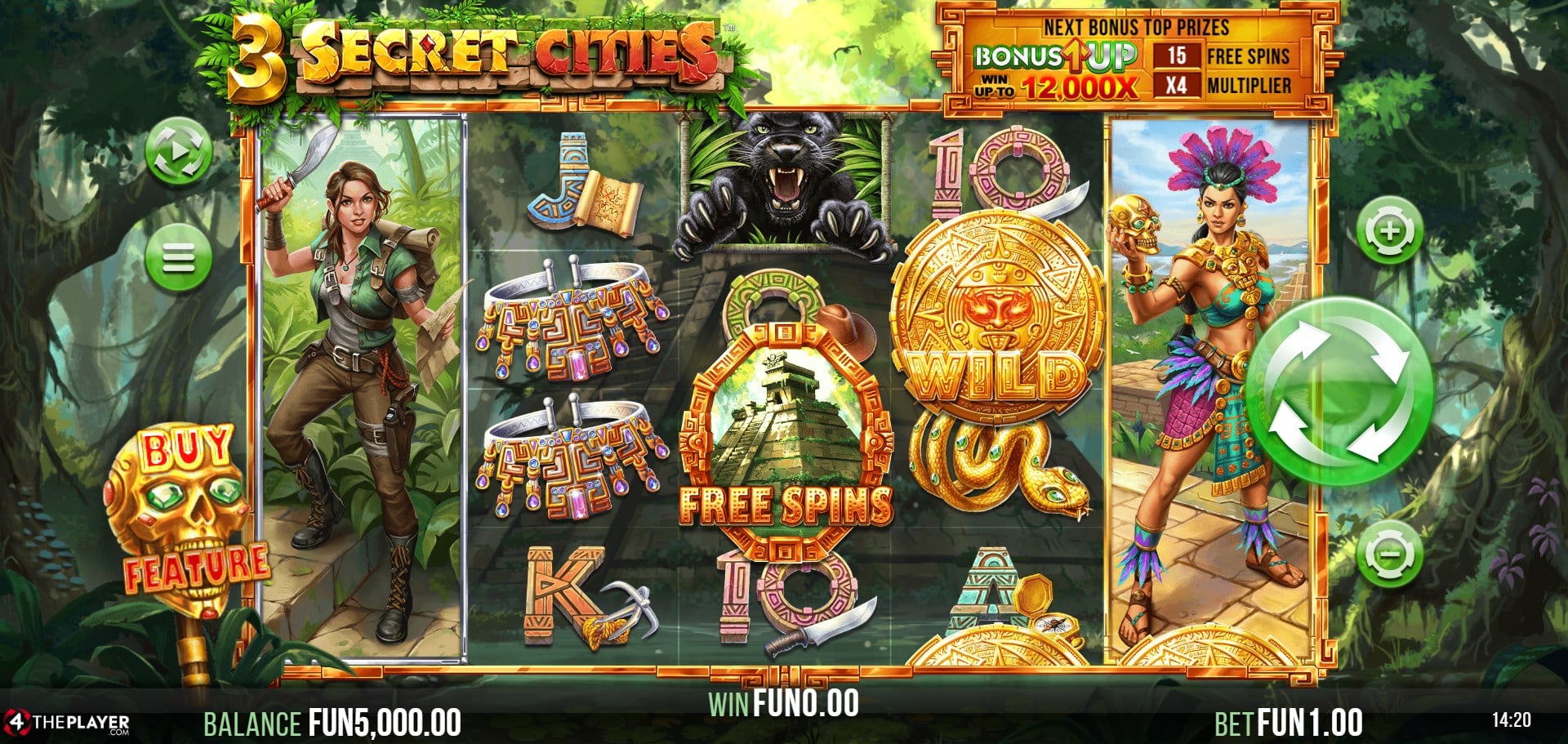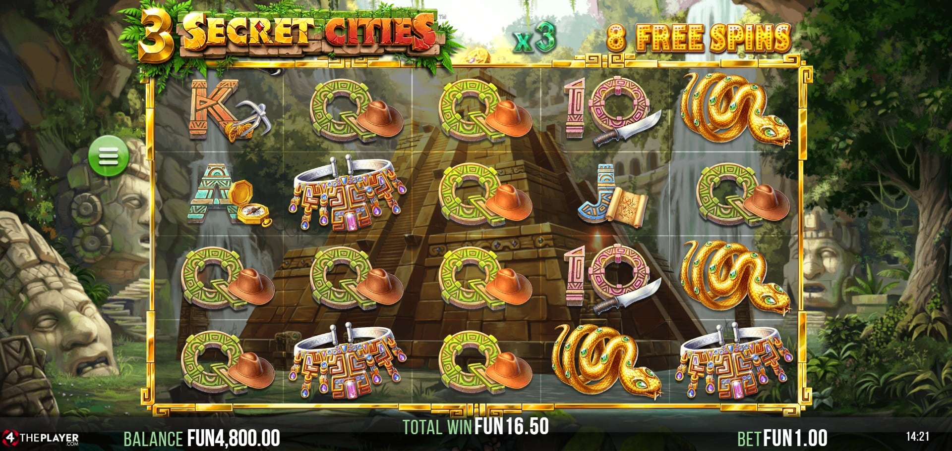 3 Secret Cities by 4ThePlayer takes players deep into the jungles of an Aztec/South American adventure, combining a familiar theme with a unique map progression system. The slot transports you from one hidden location to another—Jungle City, Lake City, and Gold City—with each step offering progressively better rewards. The game is designed to keep you engaged through its layered free spins feature, which becomes more lucrative the further you advance.