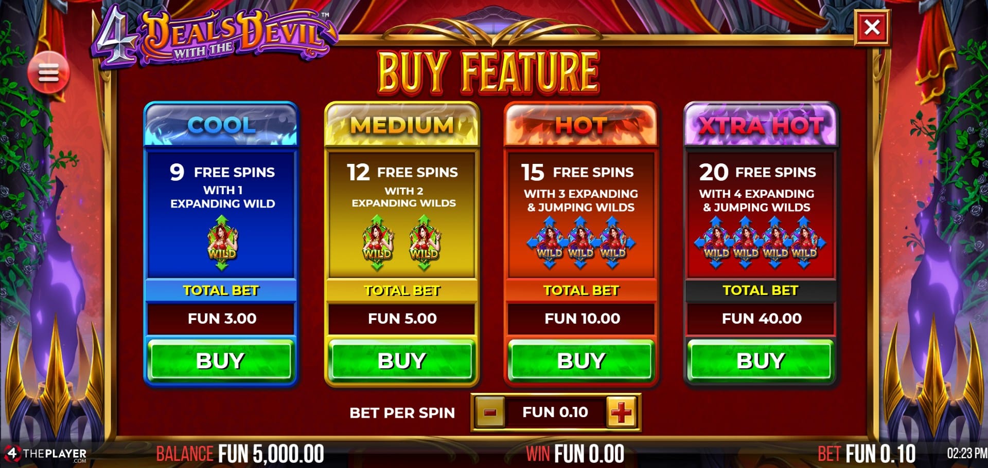 4 Deals With The Devil stands out for its player choice mechanic, allowing a degree of strategic control rarely seen in high-volatility slots. This system keeps gameplay engaging, as players can tailor volatility and potential to their own style—switching between frequent, lower-risk Cool mode and ultra-volatile Xtra Hot mode on the fly.