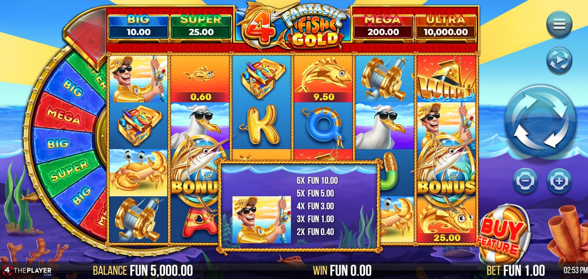 The most notable difference this time around is the addition of a prize wheel hovering above the reels, offering players an extra thrill when coins land in the base game. As a high-volatility slot with a 4×6 reel layout and 4,096 ways to win, 4 Fantastic Fish Gold combines progressive-style features with modern visuals. While it doesn’t break completely new ground, the slot leans heavily on tried-and-tested mechanics and nostalgic charm, offering an approachable yet potentially explosive experience. It’s fishing—4ThePlayer style—with added gold.