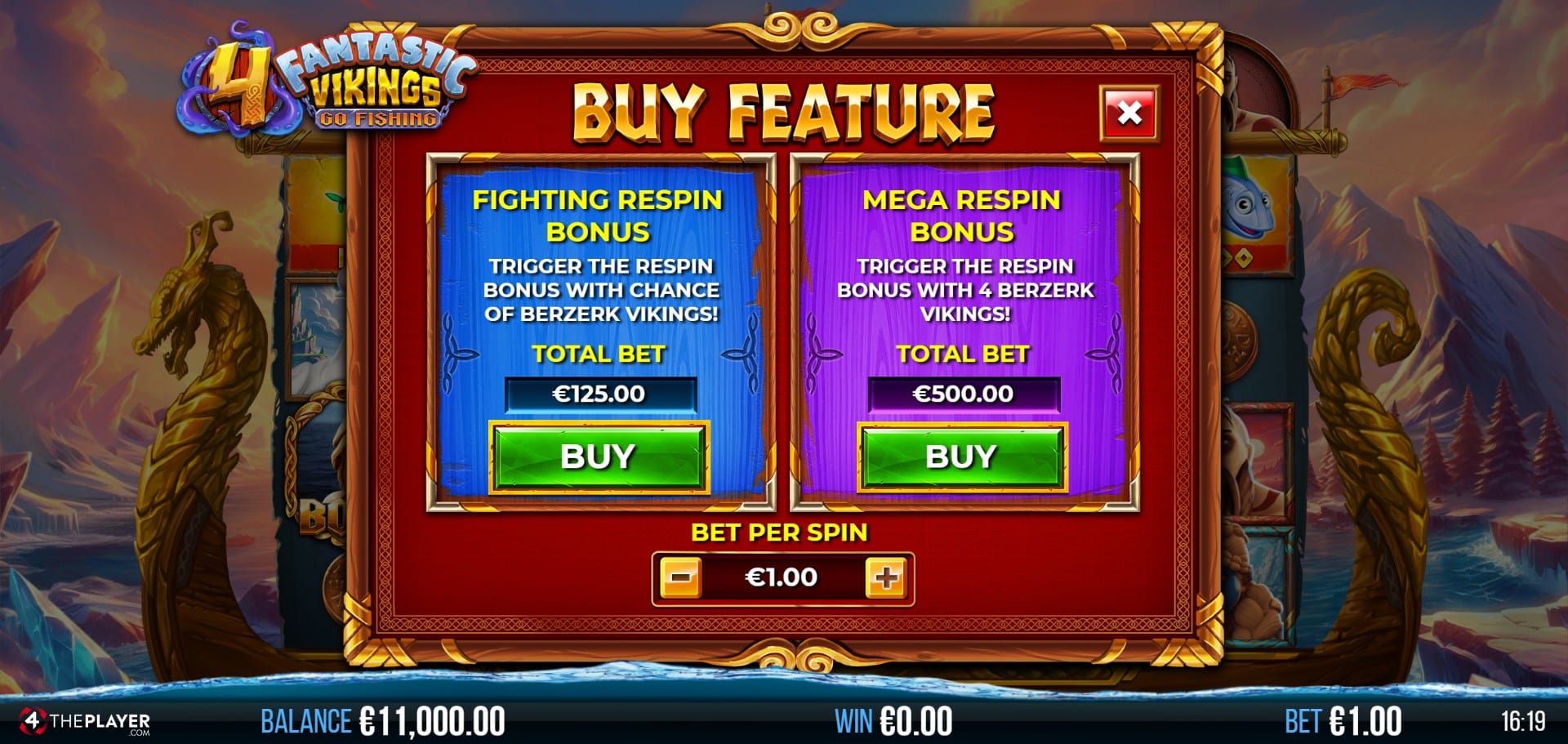 500x the bet buys the Mega Respins Bonus, where all 4 Vikings are Berserk, dramatically increasing win potential.