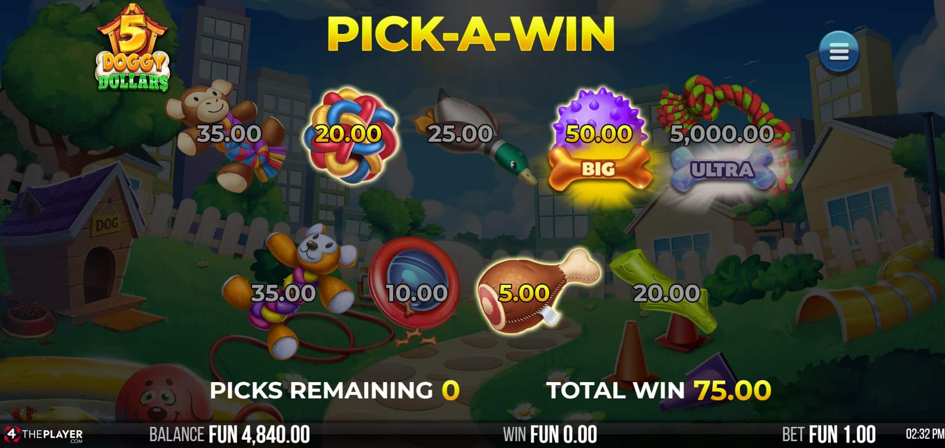 Triggered by landing 3, 4, or 5 Pick-A-Win scatters, awarding the same number of picks. Players choose from colorful dog toys, revealing prizes worth 5x to 5,000x the bet.