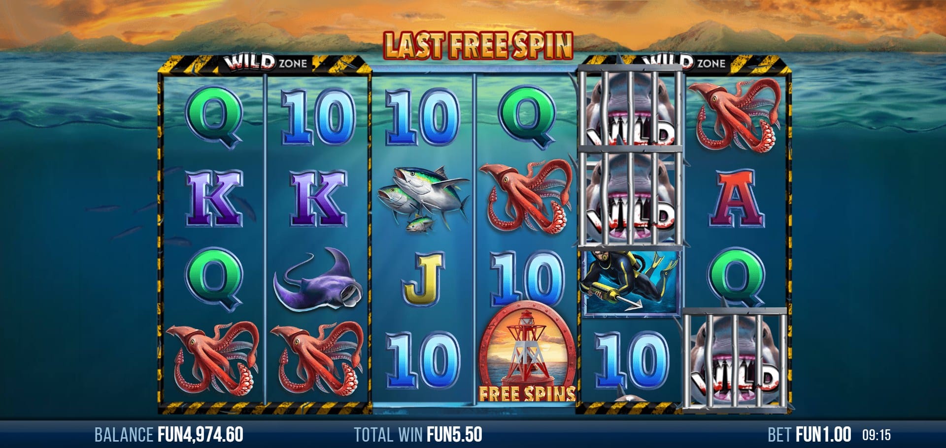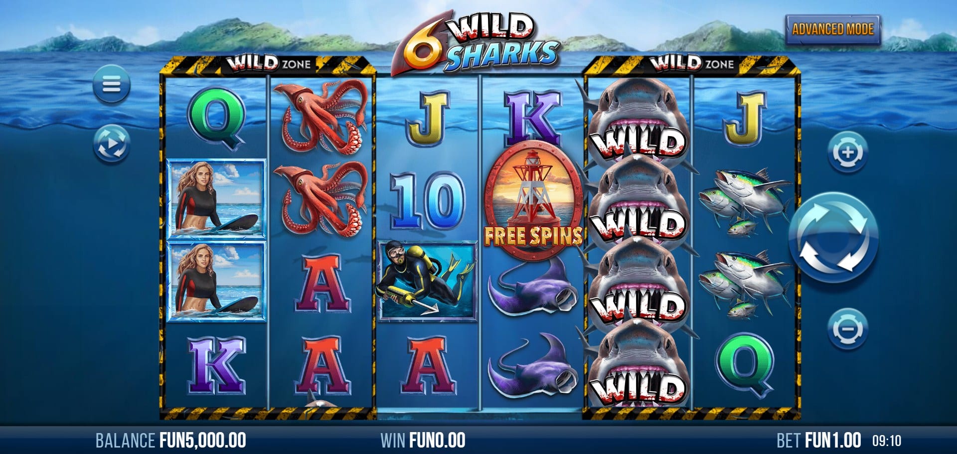 Advanced Mode: You start with 10 free spins, keeping any locked wilds you placed in the base game. Any new shark wilds that land during the feature become locked for the remainder of the free spins.
