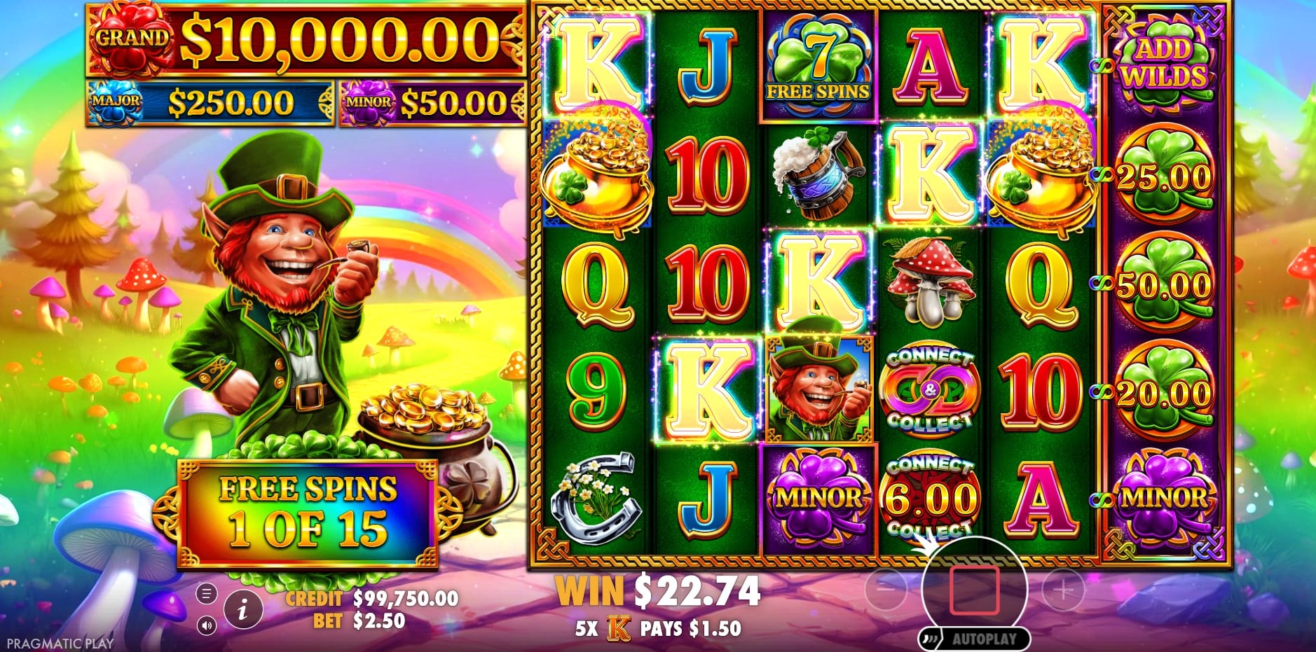 The slot’s features elevate base gameplay through dynamic collection and progression mechanics. The core Connect & Collect triggers on adjacent symbols (values 0.2x-50x), paying instantly and forming chains to special positions. Reaching reel 3 specials or the 6th reel unveils Clover modifiers: Respins lock Collect symbols for 5 respins, collecting all at end; Money Value awards 2x-160x instantly; Add Wilds scatters Wilds on reels 2-5; Free Spins Clover grants 7-25 spins + 2x bet; Jackpots pay fixed amounts (Minor 20x, Major 100x, Grand 4000x).