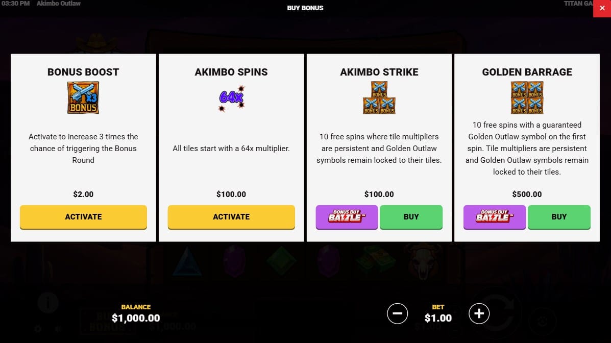 | Akimbo Strike | 3 Bonus Symbols | 10 | Persistent multipliers, sticky Golden Outlaws firing every spin |
