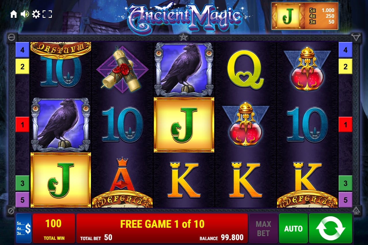 Ancient Magic adheres to a conventional five-reel, three-row layout with five fixed paylines, a setup that streamlines the player experience by eliminating the need to select or adjust lines—every spin evaluates all five automatically. Wins form exclusively from left to right, requiring three or more matching symbols on a payline for low-value royals (10, J, Q, K, A), while high-value theme symbols like the Witch, Raven, Magic Potion, and Scroll can pay from two matching instances in some cases, injecting efficiency into the base game flow.