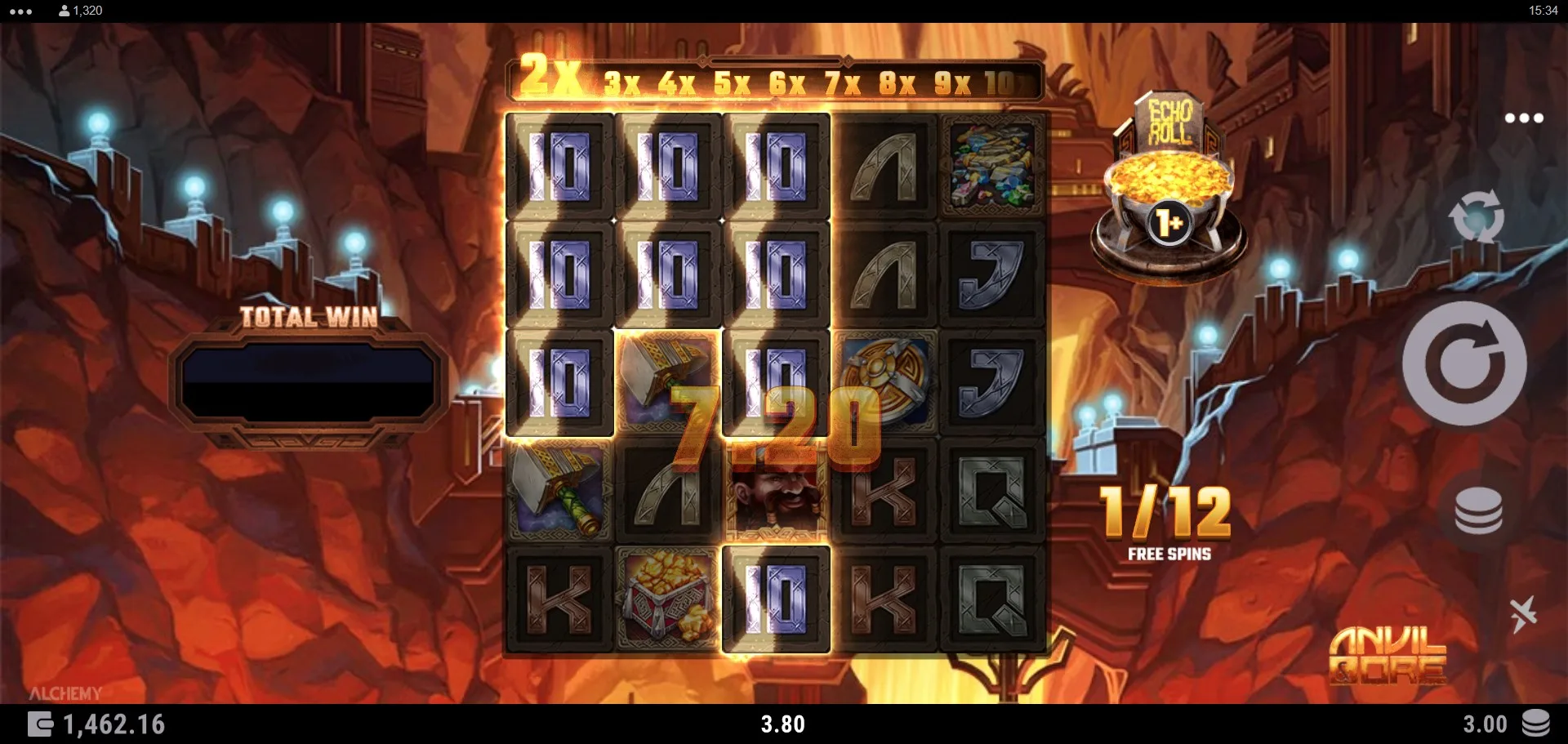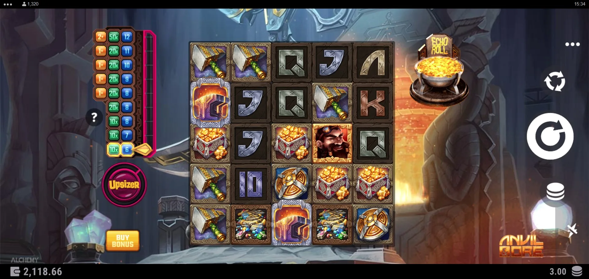 Alchemy Gaming has paired Anvil & Ore’s visuals with a suitably weighty soundscape. The soundtrack features deep, industrial percussion, metallic clangs, and low rumbling tones that evoke the sense of being deep underground. During Rolling Reels, cascading explosions are accompanied by clinking metal, while Echo Rolls have a molten, bubbling sound effect that matches the glowing cauldron animation.