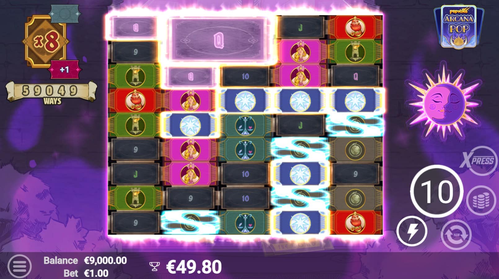 At its core, ArcanaPop operates on 5 reels with expanding rows. The game starts with 243 ways to win, but thanks to its PopWins mechanic, the grid can grow up to 9 rows, massively increasing the number of paylines.