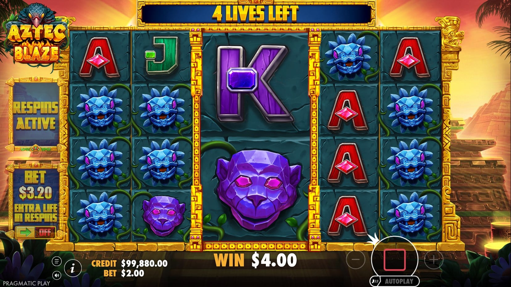 Aztec Blaze keeps features streamlined but impactful, building on the respin mechanic. The core Respins activate on any base game win, introducing a 2×2 colossal symbol that expands with each successive win, up to 4×4. Six consecutive wins unlock a persistent x10 win multiplier for the remainder of the sequence. The optional Extra Life in Respins adds one extra respin if a win fails to land, at a 60% bet increase, prolonging chains and colossal growth.