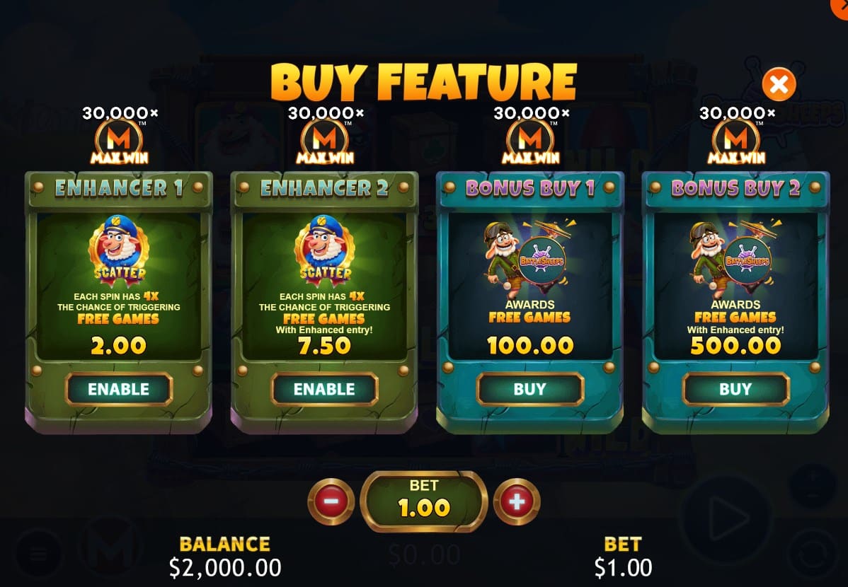 Battlesheeps shines through its cluster-pays foundation, sticky multiplier Wilds, grenade attachments, and Double Max system, paired with a cohesive cartoonish design and broad betting flexibility for sustained appeal. Drawbacks encompass prolonged base game dry spells inherent to high volatility and heavy feature dependence for maximum 30,000x potential, which may challenge brief sessions. Retriggerable free spins, layered Enhancers, and bonus buys enhance replayability. Players can test the slot risk-free using the built-in demo available on this page. Overall, it presents a solid, inventive choice for enthusiasts of volatile, thematic slots with strong payout upside.