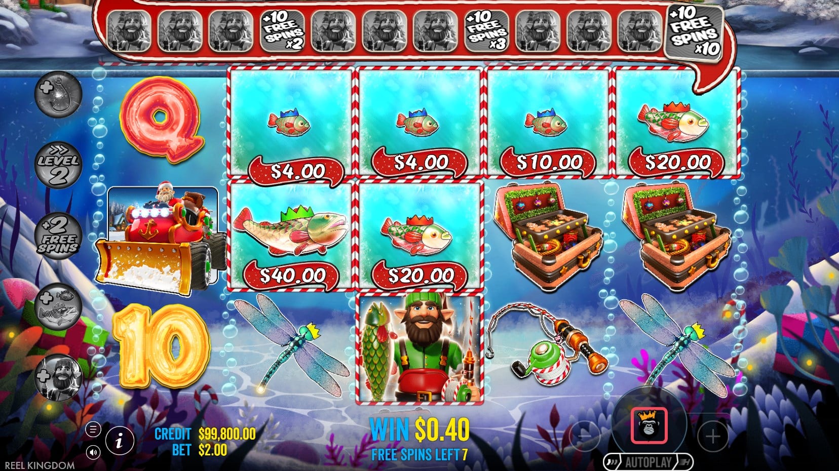 Animations are smooth and thematic: winning symbols explode with icy bursts and jingle bells, while feature activations trigger dynamic sequences like hooks reeling in prizes or dynamite blasts revealing money fish. The user interface is intuitive, with a control panel below the reels for bet adjustments, spin button, and feature toggles. Auto-spin options range up to 100 spins, and the game scales seamlessly across desktops and mobile devices, maintaining sharp visuals on smaller screens. Sound design complements the visuals with cheerful holiday tunes, splashing water effects, and triumphant fanfares during big wins, creating an engaging sensory experience suitable for festive play sessions.