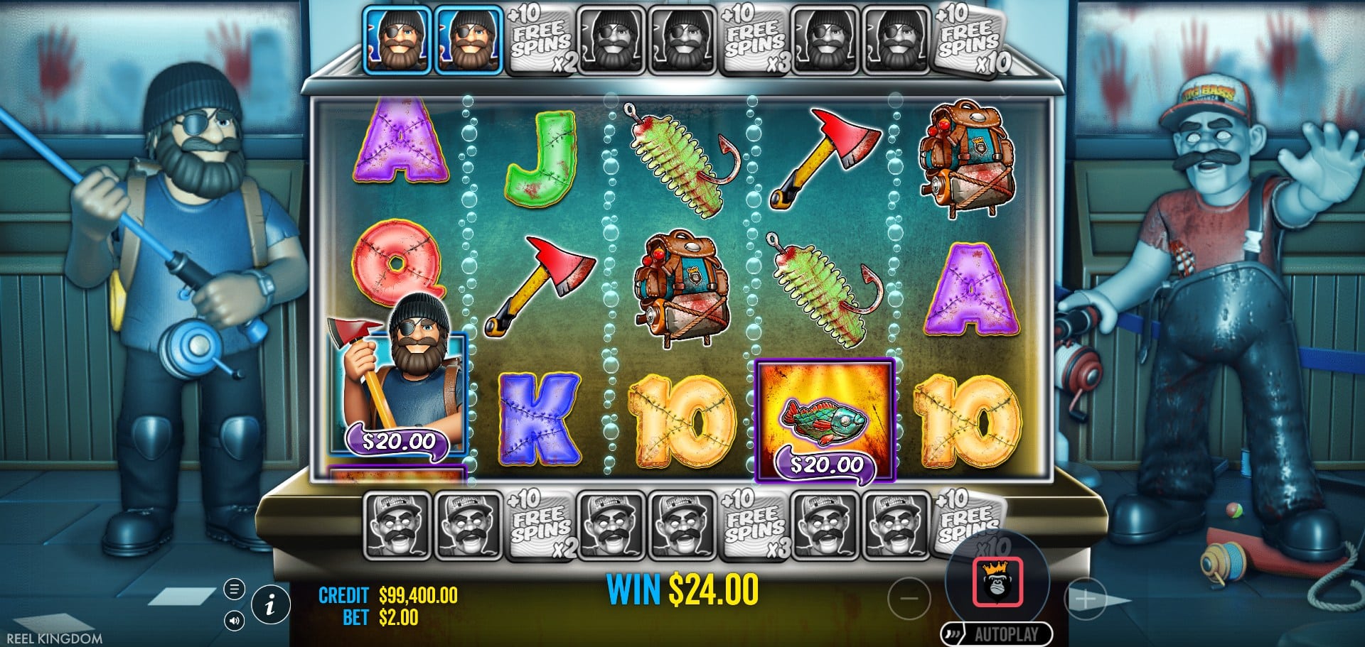 Symbol design ties everything together neatly. Alongside the traditional card royals (10–A), you’ll find premium icons like axes, backpacks, fishing lures, and a psychedelic Combi van, each rendered with the same cartoonish yet polished style that has become a hallmark of Reel Kingdom’s design work. The scatter symbol — a zombie fisherman holding a fish — triggers the main feature, while the fish symbols themselves double as money symbols, glowing green as they swim across the grid.