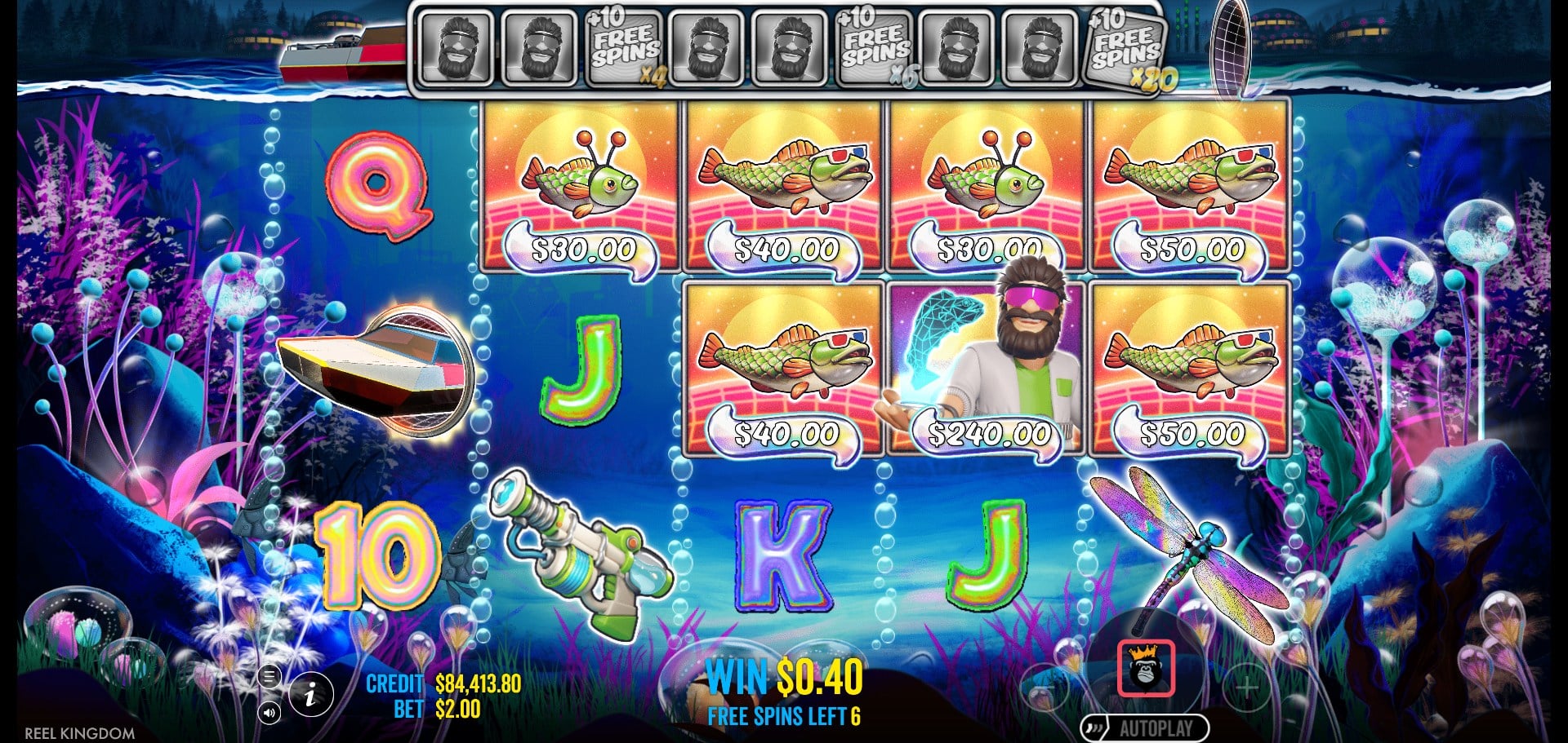 That said, the game preserves much of its visual DNA. Bubble-framed reels, underwater plants, drifting fish, and the classic cartoonish objects—dragonflies, boxes, fish symbols, boats—make it instantly recognizable as a Big Bass title. The Fisherman himself sports an ’80s-inspired time-traveler/trickster look, blending nostalgia with absurdity, giving the slot an extra blast of personality.