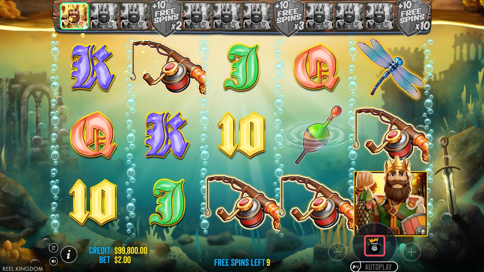 Animations are smooth and thematic—bubbles rise during spins, winning symbols pulse with golden glows, and bonus triggers unleash curtain reveals or hook pulls. The background maintains a serene yet mysterious ambiance with rippling water effects and faint light rays piercing the depths. Control panels, including Ante Bet and Feature Buy buttons to the left, integrate seamlessly without cluttering the interface. Audio design features tranquil underwater hums punctuated by triumphant medieval fanfares on big wins, enhancing immersion. Overall, the design upholds Reel Kingdom’s polished standards, balancing whimsy and elegance for broad appeal.