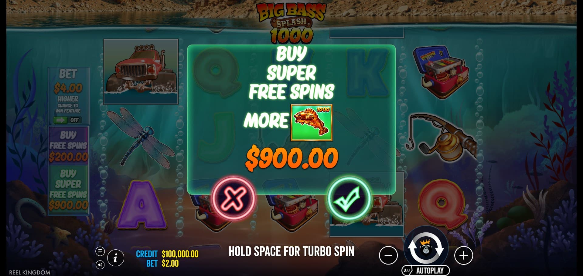 Symbols include brightly colored 10–A royals, along with thematic icons like fish, tackle boxes, dragonflies, reels, and automobiles. The overall visual quality has been subtly refined, featuring sharper textures and smoother animations that make each catch feel more dynamic. The design doesn’t aim to surprise but rather to comfort — it’s a cozy return to the series’ visual roots with enough polish to justify its “1000” branding.