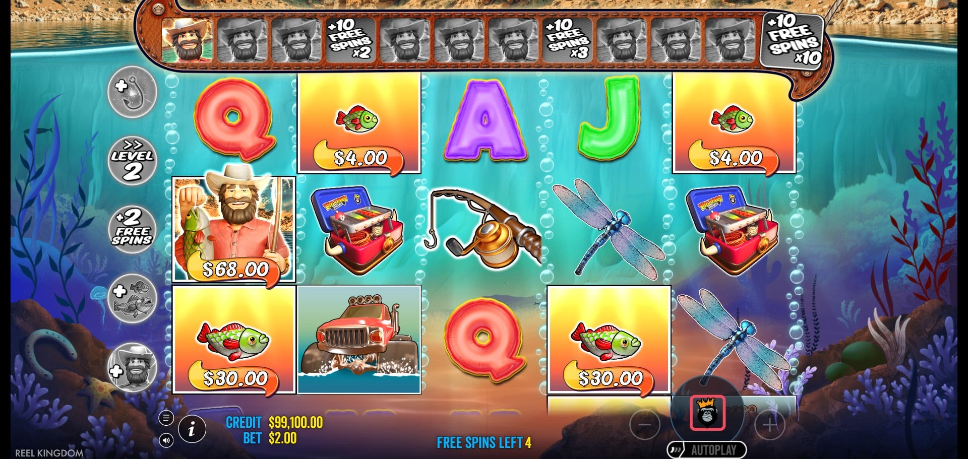 During free spins, every wild fisherman collects the values of all fish money symbols in view. After collecting four wilds, the feature re-triggers, awarding +10 additional spins and increasing the multiplier for money symbols — x2 for level 2, x3 for level 3, and a massive x10 for level 4. Once the fourth retrigger is reached, the round can no longer be extended, but by that point, the excitement usually peaks.