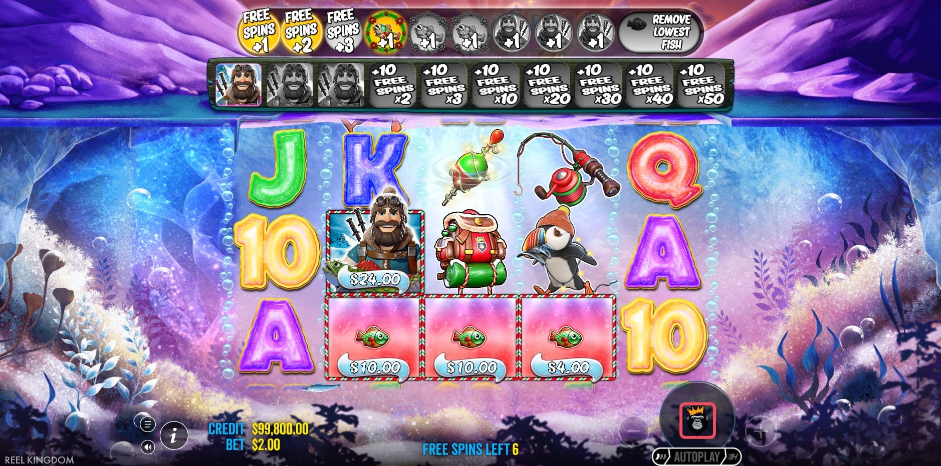 The core excitement lies in the Free Spins round, triggered by 3+ Scatters (gift boxes) for 10 spins. A pick mini-game precedes it: select gift boxes on a Christmas tree to reveal modifiers until a boot ends it (4/5 Scatters start with 1/2 reveals). Two base-game aids for 2 Scatters: respins with Scatter nudges or a narwhal transforming a symbol to Scatter. In Free Spins, Fisherman Wilds collect Money values; every 4th grants 10 extra spins and upgrades the Money multiplier (x2 level 2, x3 level 3, x10 level 4, x20 level 5, x30 level 6, x50 level 8—no more after).