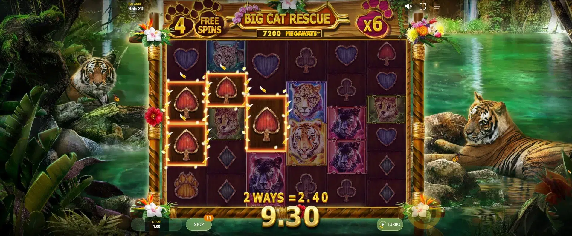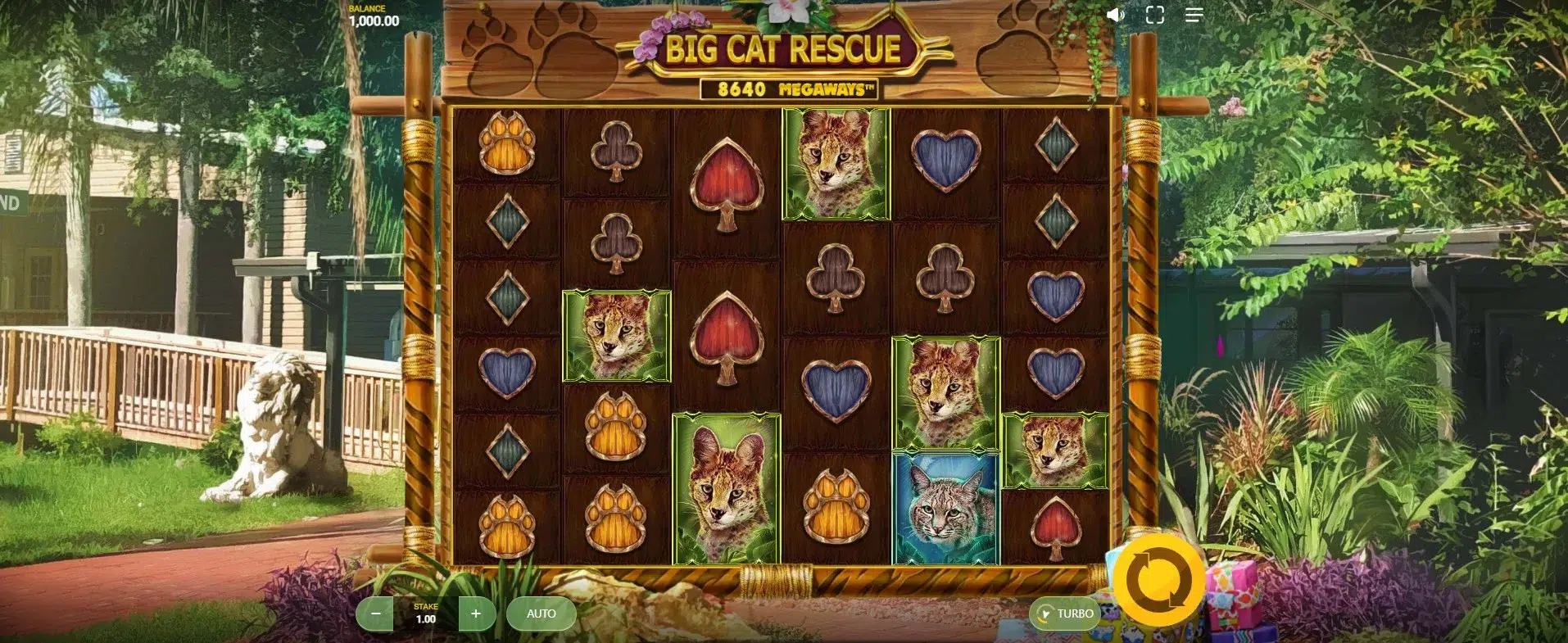 Big Cat Rescue Megaways is set against a lush, tropical backdrop that recreates the sanctuary’s natural surroundings. The visual design is bright and inviting, with a green-rich jungle setting featuring exotic flora and subtle background details like bamboo, streams, and lounging big cats. The reels are framed in wood and vines, giving the game a tranquil yet immersive feel. Symbol design ranges from elegant to emotive. Low-paying symbols are represented by classic card suits—clubs, diamonds, hearts, and spades—stylized with paw prints and soft gradients. High-paying symbols feature portraits of big cats, rendered with striking detail and expressive eyes that add a sense of emotional weight to the game. When these majestic animals form winning combinations, they exude both beauty and melancholy—fitting for a slot with a conservation message.