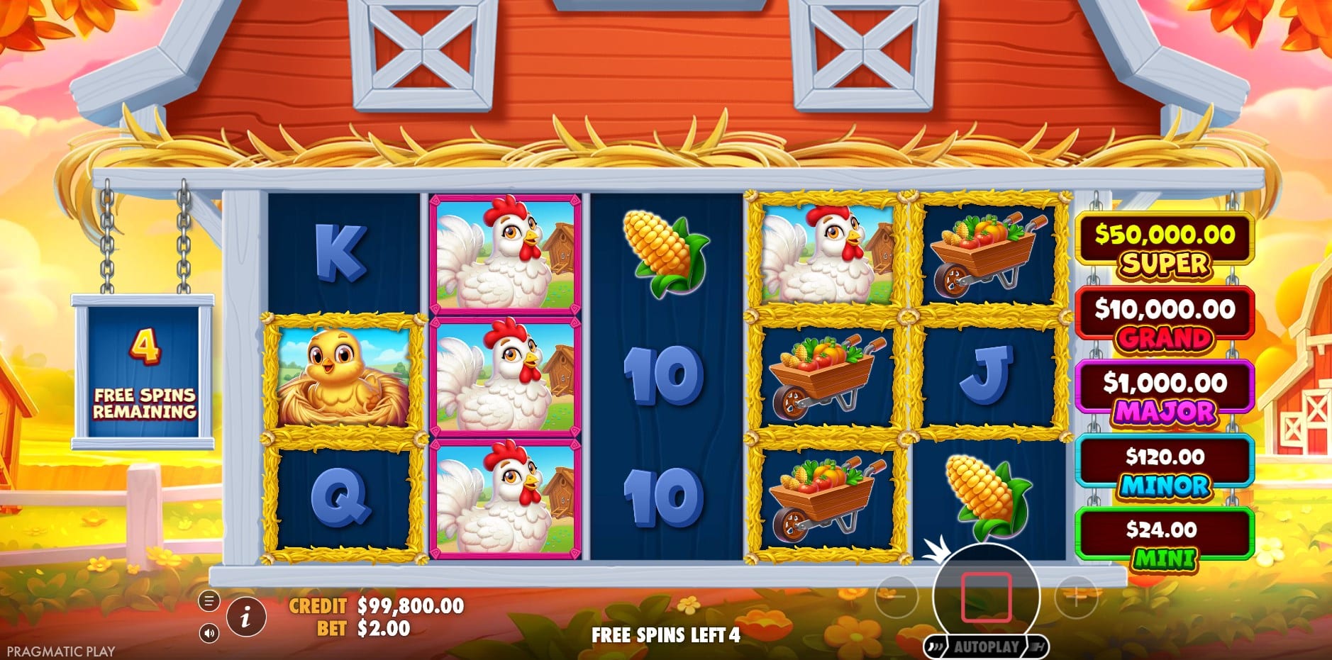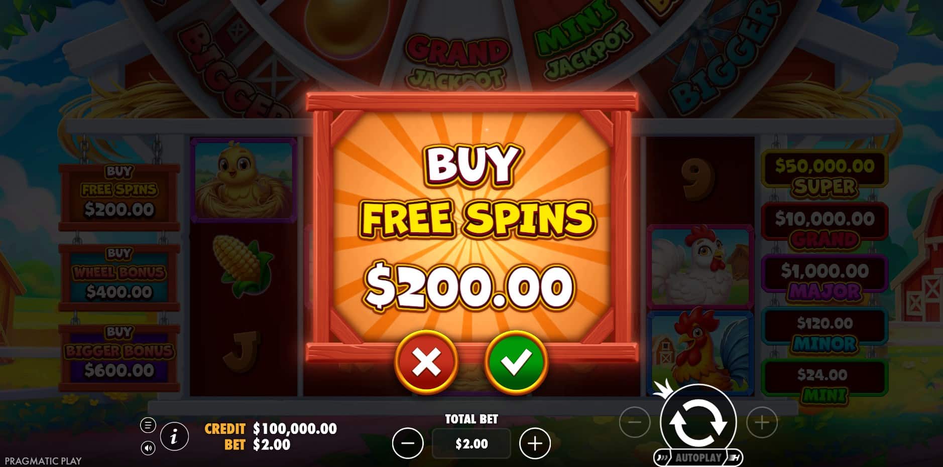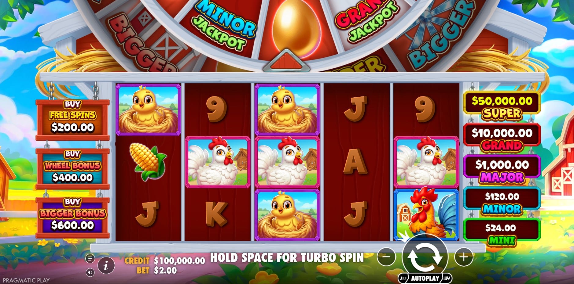 Bigger Bonus expands to 5×6 grid: enhanced Mega Egg (multiple oversized Scatters); Bigger Windmill/Barn House (duplicates Wheel/Golden Wheel on new top rows); Random Jackpot including Super (25,000x).