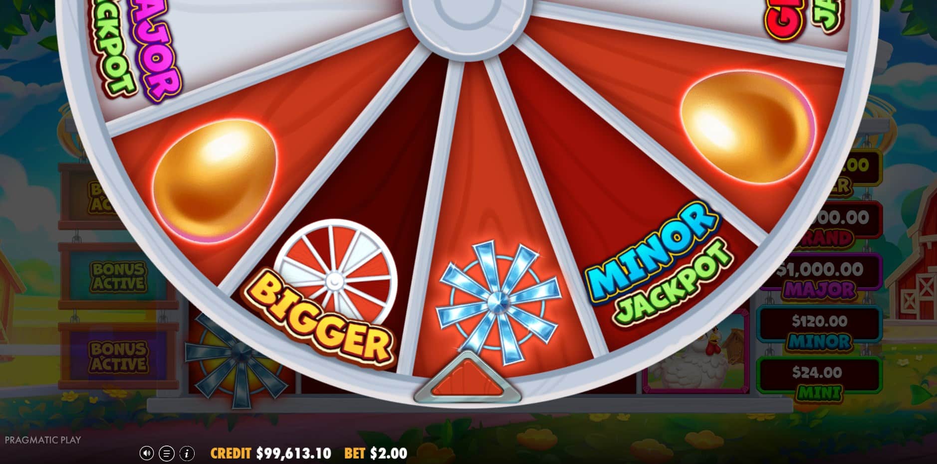 The Bonus Wheel, activated by 3+ Wheel Bonus Symbols in the base game, spins for random outcomes: Mega Egg (places oversized 2×2/3×3/5×3 or dual 2×2 Scatters to start Free Spins with pre-marked positions); Windmill (Free Spins with upgraded marks); Barn House (Free Spins with Wheel Symbols as brick marks, Scatters as brick); Random Jackpot (Mini 12x, Minor 60x, Major 500x, Grand 5,000x); or Bigger Wheel (activates Bigger Bonus).