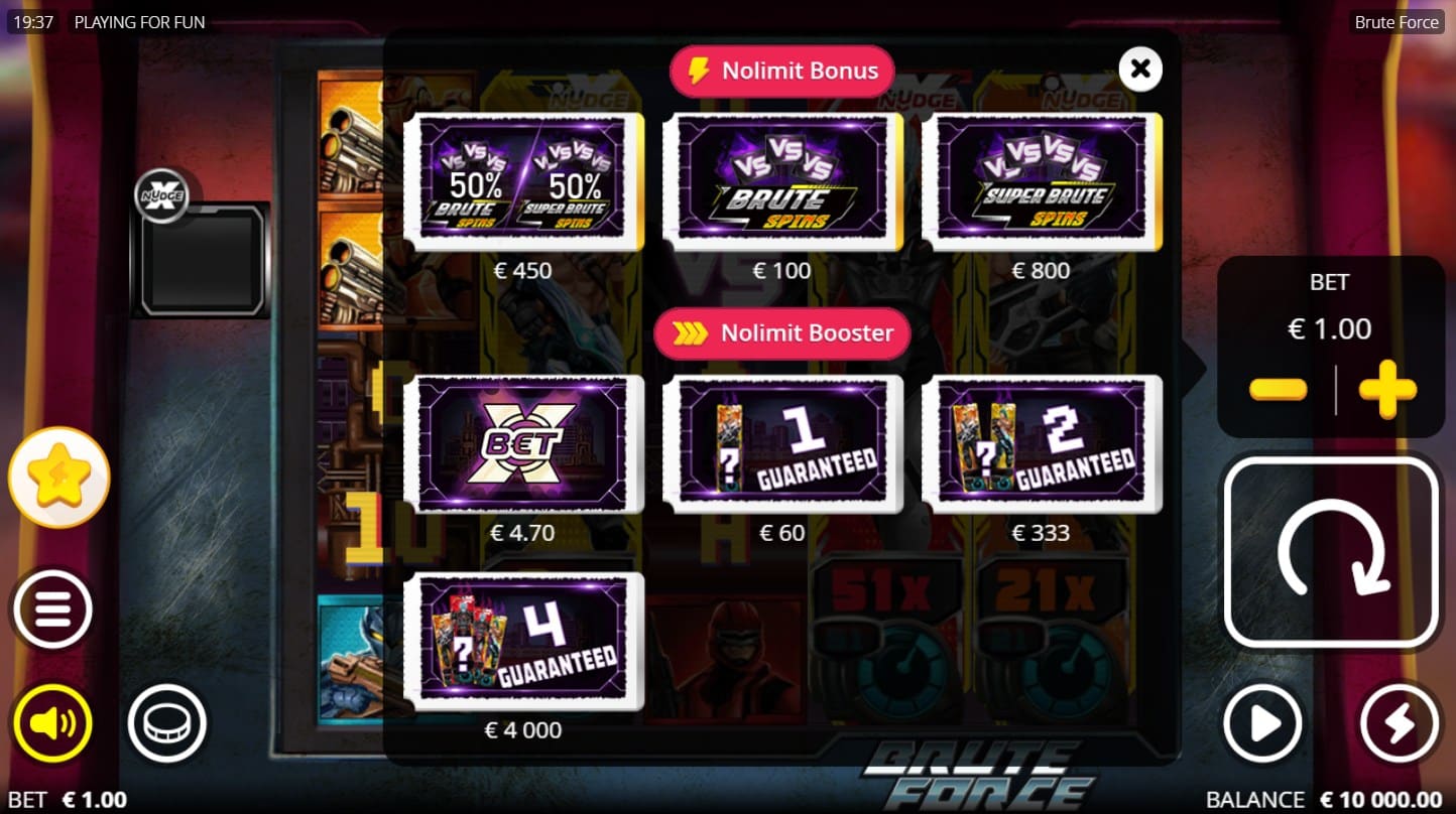 Feature Buy allows direct access: Brute Spins (100x bet), Super Brute Spins (800x bet), or Lucky Draw (450x bet, 50% chance of either). These integrate xNudge mechanics for prolonged engagement, with sticky Wilds in Super variant amplifying volatility.