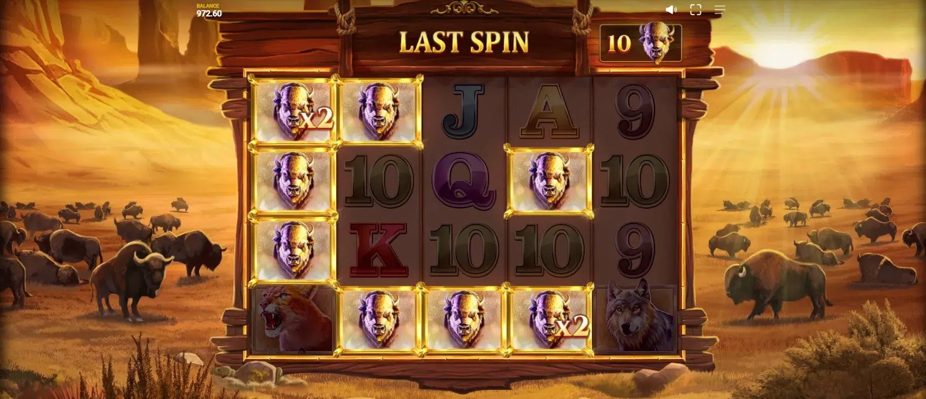 Spin 10: All collected symbols drop onto the grid in random positions. Multiple buffaloes in one space trigger multipliers (e.g., x2, x3, etc.).