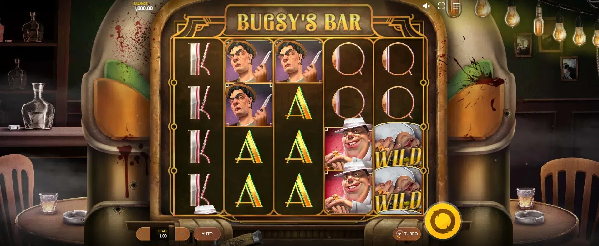 Visually, Bugsy’s Bar leans hard into its 1920s gangster theme, channeling old-school Americana through sepia tones, stained bar walls, vintage slot panels, and classic pub paraphernalia. The setting is appropriately grimy: a cocktail of bullet holes, blood spatter, broken lights, and stained wallpaper. Liquor bottles, cigar smoke, and looming gangster silhouettes round out the tone, creating a dim and dangerous environment that pairs perfectly with the noir theme.The reels are stylized as a retro jukebox (or possibly an Art Deco bar machine), and symbols feature a mix of fonted card royals, a cash bag, and gangster characters. You’ve got the slick-haired goon, the sharp-looking dame, and the bespectacled mob boss—all suitably shady figures in this underworld drama. The attention to period detail in the visual storytelling is admirable, and while the graphics don’t break new ground technically, they effectively immerse you in Bugsy’s smoky barroom scene.