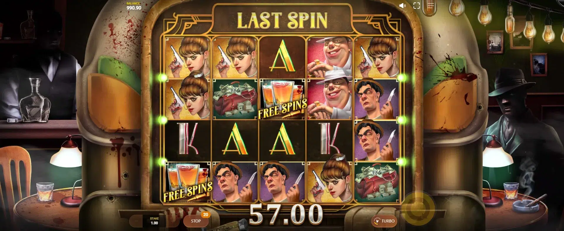 Sound effects are equally well-designed—muted gunfire, glass clinks, and deep bass thuds punctuate spins and wins, adding flair to even small victories. The occasional character voiceover or ambiance line further reinforces the setting, even if it doesn’t dramatically alter the gameplay experience.