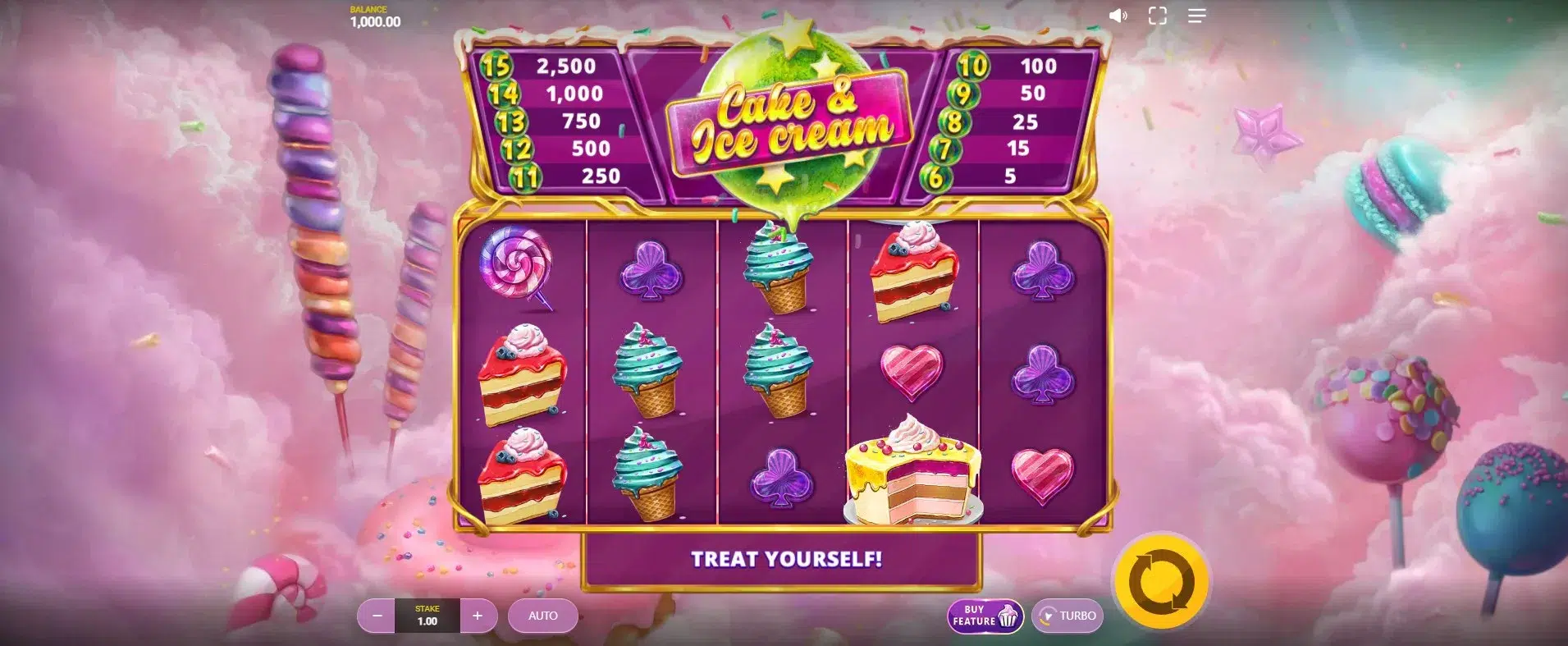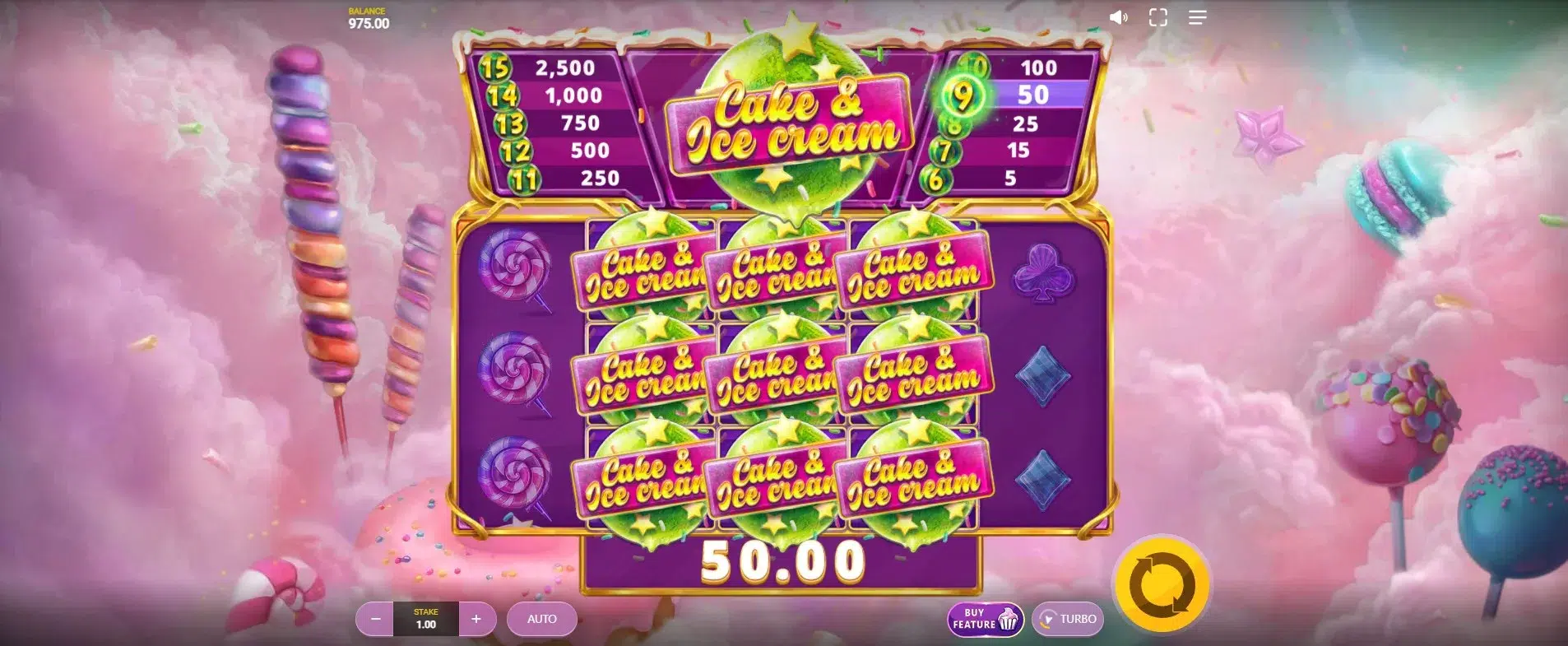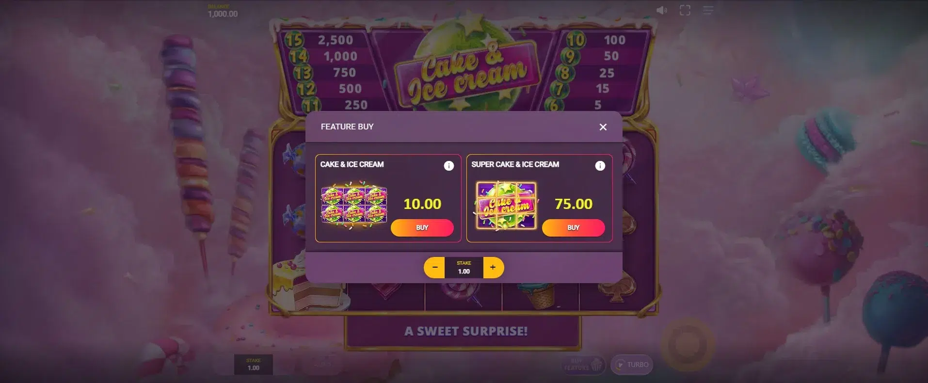 For players in regions where feature buys are permitted, Cake & Ice Cream offers two purchase options:10x the bet: Triggers a spin with enhanced chances of landing regular Cake & Ice Cream symbols.