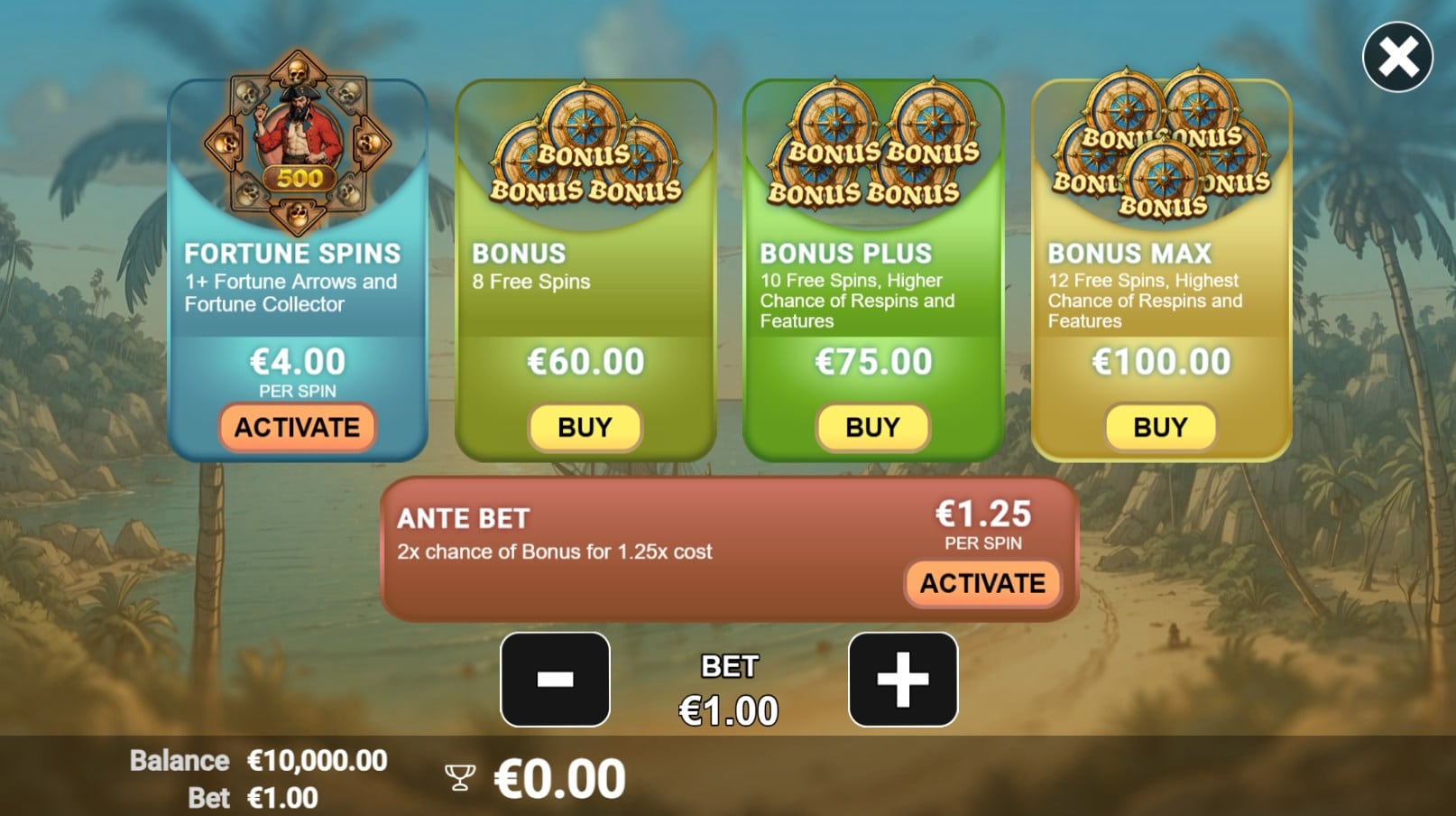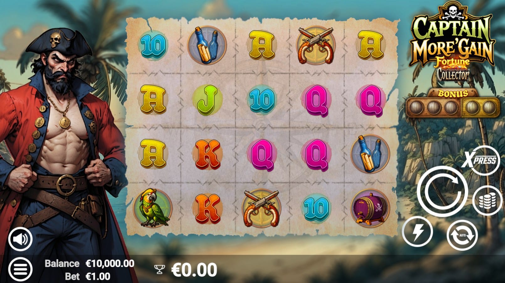Played on a 5×4 reel set with 1,024 ways to win, Captain More’gain blends the classic thrills of pirate slots — palm trees, golden sunsets, and treasure maps — with a roaming respin system that keeps the action lively. It’s a high-volatility game with a hit frequency of 27.91%, a maximum payout of 10,000x, and a top RTP of 96%. Bets range from €0.10 to €300, with an Ante Bet option boosting bonus chances by 100% for an extra 25% stake.
