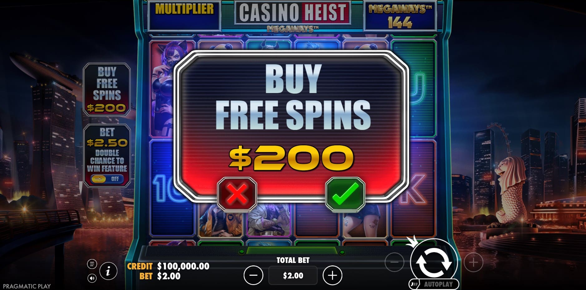 Casino Heist Megaways is a Pragmatic Play slot released in 2024, immersing players in a futuristic cyberpunk theme set in Singapore. The backdrop showcases a vibrant cityscape featuring the iconic Merlion statue and the distinctive Marina Bay Sands casino and hotel with its unique architecture resembling a ship atop three towers. This Megaways slot caters to fans of high-volatility games with dynamic winning potential, offering up to 117,649 ways to win through cascading reels and multiple bonus features. It appeals to experienced slot enthusiasts seeking thrilling gameplay with substantial payout opportunities in a visually striking urban heist environment.