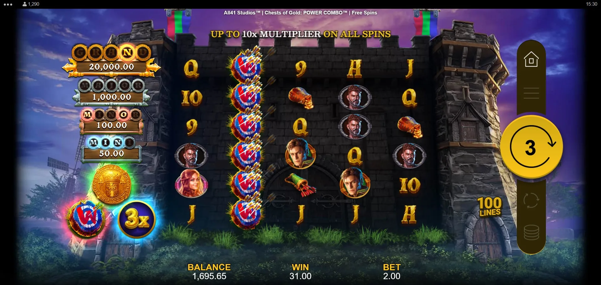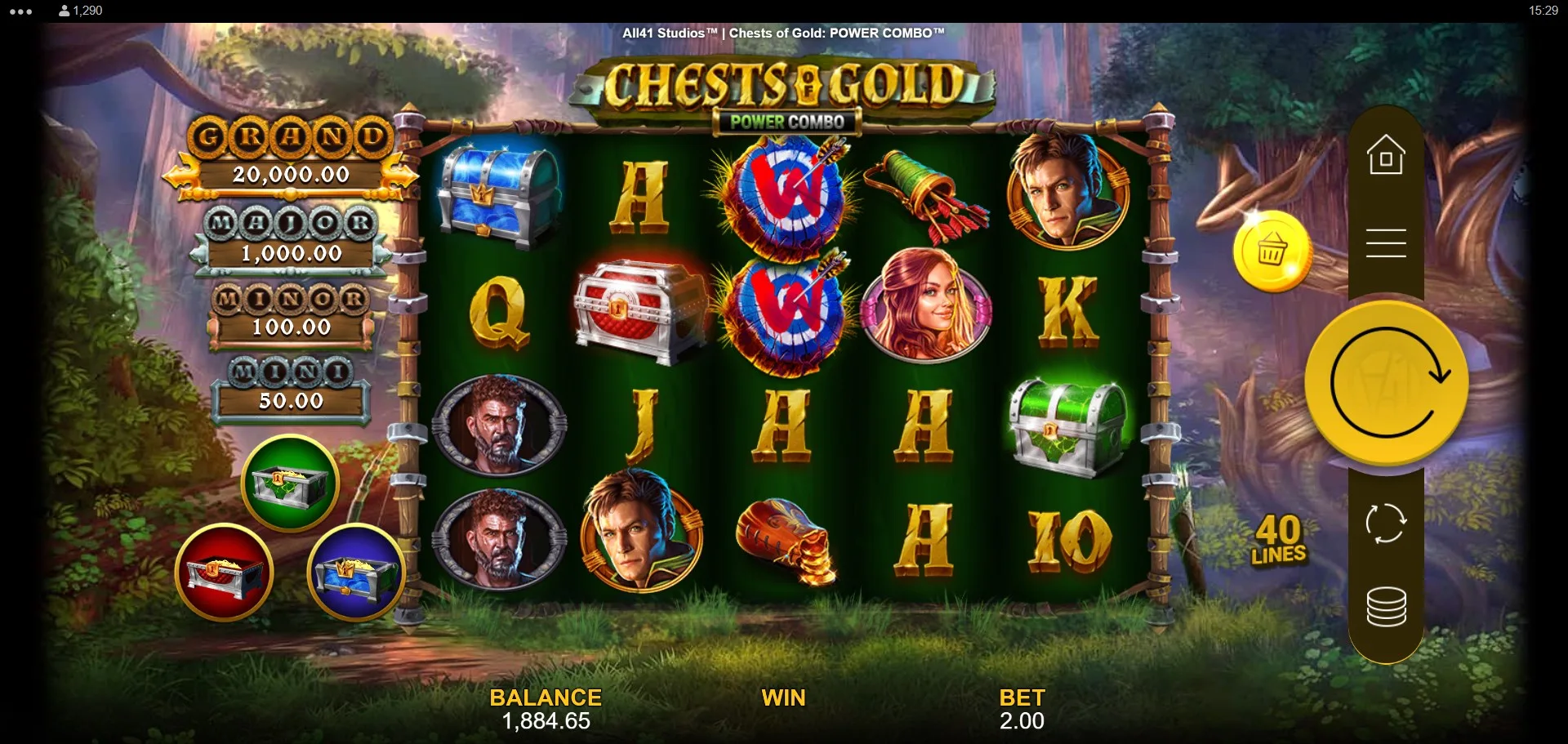 Chests of Gold Power Combo is a visually polished and mechanically versatile slot that builds on the framework of its predecessor, Kings of Crystals, while shifting to a Robin Hood-inspired treasure hunt theme. Although the core structure will feel familiar to players who experienced the earlier title, the medieval setting, character art, and chest-triggered Power Combo system give it its own charm.