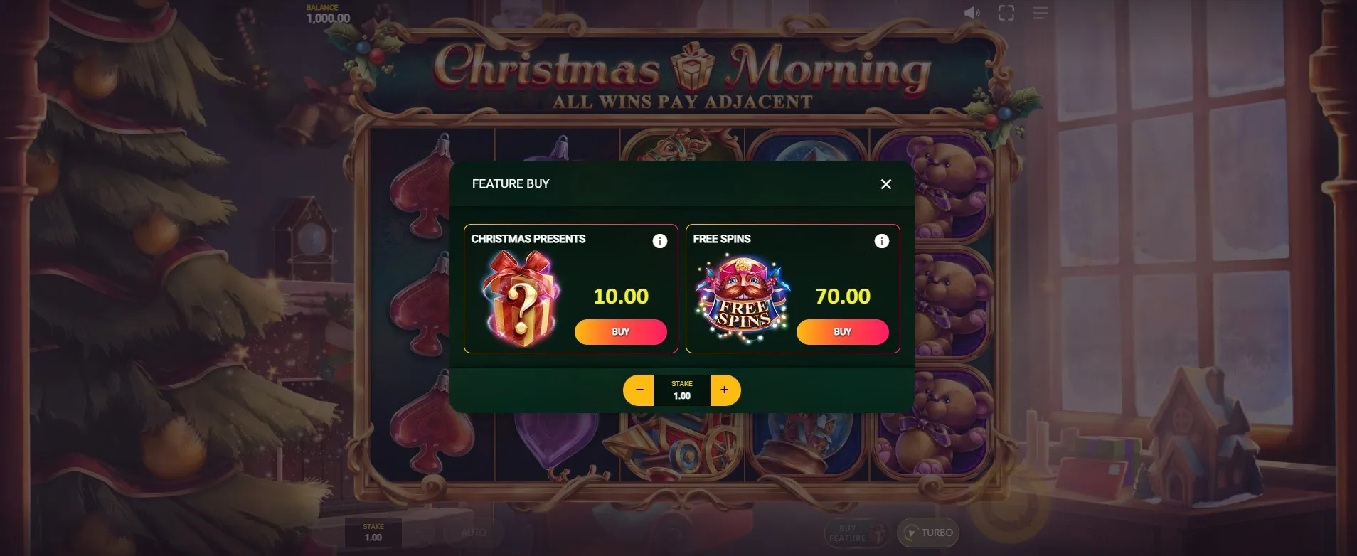 There are two buyable features:One allows you to buy into the Christmas Present feature for 10x your bet