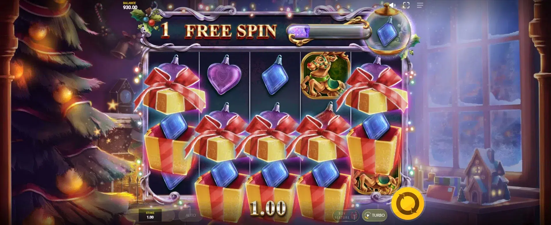 Triggered by landing 3, 4, or 5 scatter symbols, players receive 12, 15, or 18 free spins respectively. During this round, scatter symbols are removed, and the focus shifts to collecting Christmas presents.