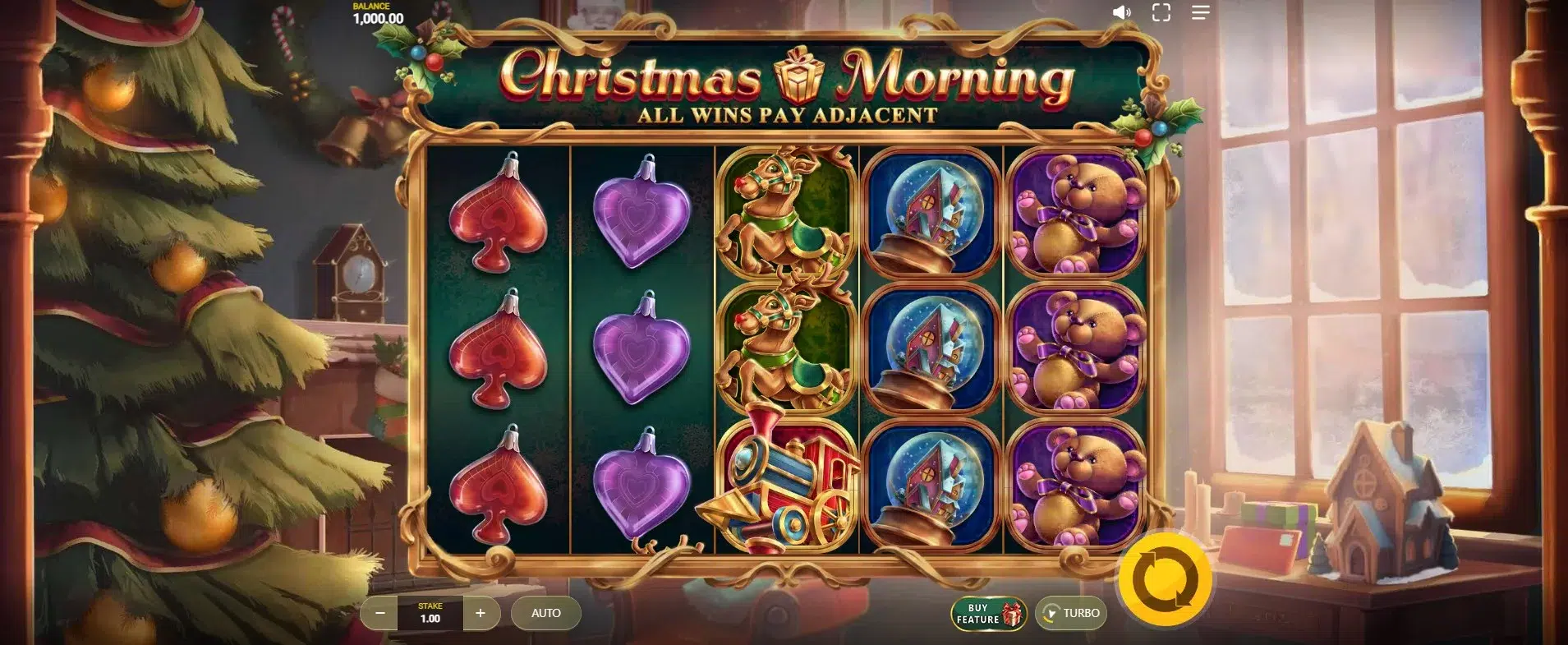 The slot is structured with 5 reels, 3 rows, and 10 paylines—but with a twist. Rather than sticking to traditional left-to-right payline logic, Christmas Morning allows all wins to pay adjacent, meaning symbols can land anywhere on the reels as long as they’re adjacent. This creates a more flexible and engaging experience.