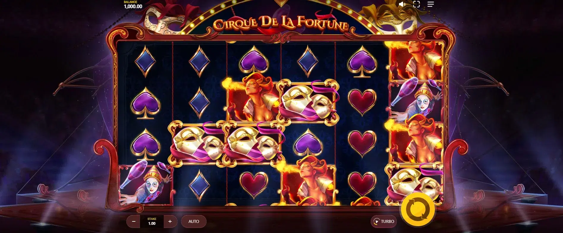 From the very first spin, Cirque De La Fortune sets a visually striking tone. The game combines the mystery of Venetian masquerades with the pageantry of a traveling circus. The backdrop is filled with spotlights, curtains, and stylized arches that feel lifted from a carnival stage. It’s part parade, part illusionist’s den—vibrant, if slightly over-decorated.The reels are stacked with symbols that reinforce the theme. Low-paying symbols are the classic card suits—spades, diamonds, hearts, and clubs—but they’re elegantly adorned to match the game’s opulent circus styling. High-paying symbols include colorful circus characters: a juggler, a mime, a clown, a fire-breather, and a masked figure. The latter is the top-paying symbol, worth 10x the stake for a full line.