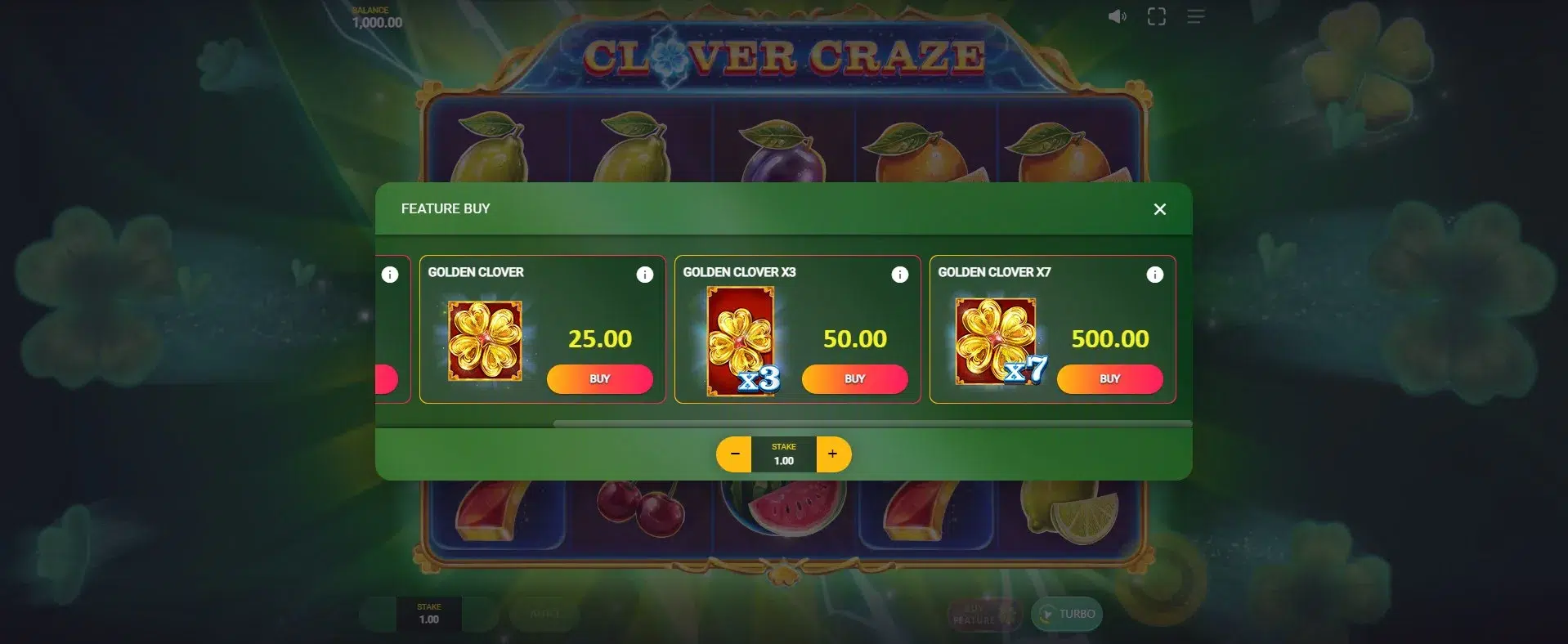 Red Tiger has included four separate bonus buy options for players who want to skip straight to the action:Green Clover Buy: 5x the stake.