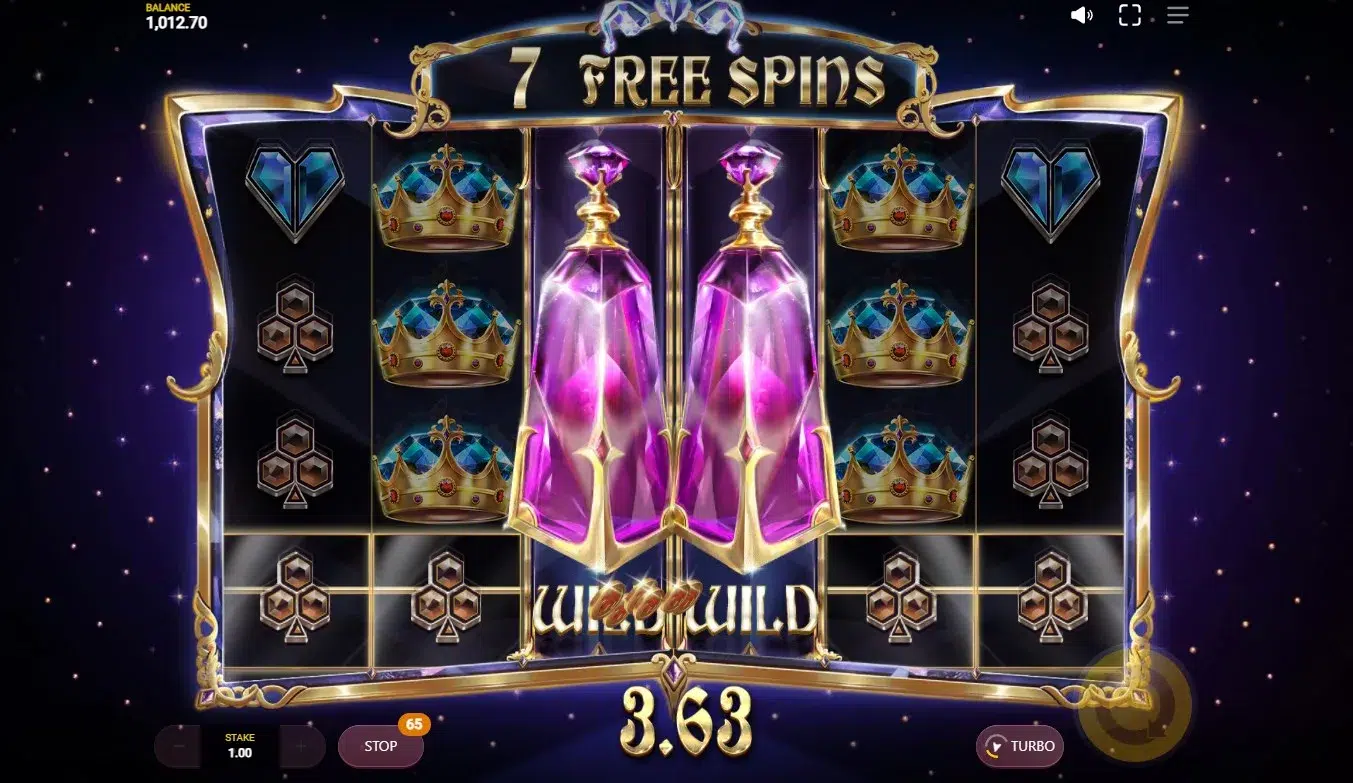 The Super Wilds, shaped like glowing pink potion bottles, add a theatrical flair when they appear—especially when they nudge into position to cover a full reel. This game won’t win awards for innovation in graphics, but it’s stylish and clean, fitting perfectly with the game’s high-society jewel theme.