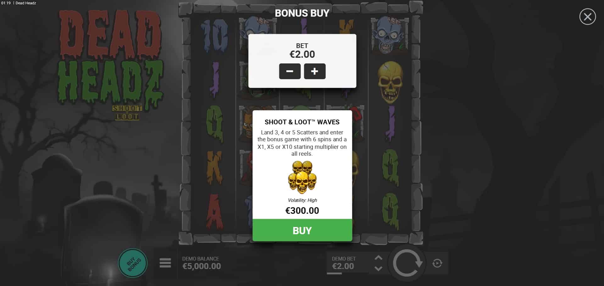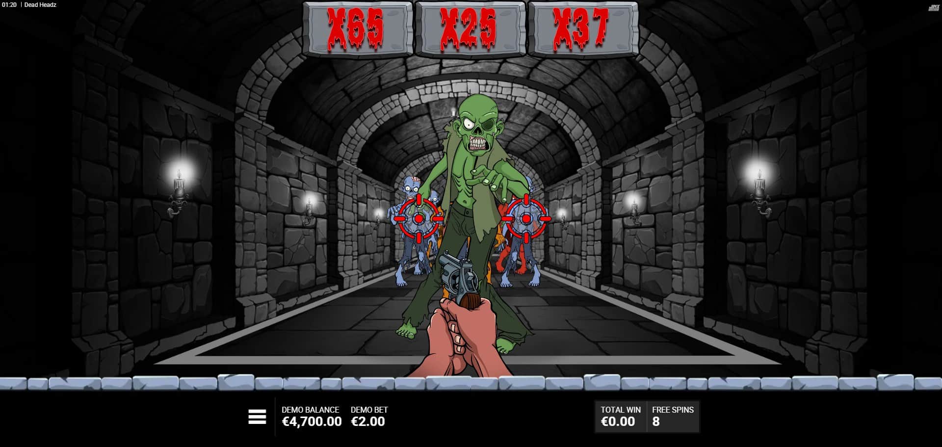 Dead Headz operates on a 5×5 grid with 19 fixed paylines, where wins form by landing three or more matching symbols starting from the leftmost reel and continuing rightward on adjacent reels. Bets range from €0.10 to €100 per spin, accommodating various player budgets. The base game flows with standard spins, a hit frequency of 26.98%, and Wild symbols that substitute for all regular paytable symbols (low and high-paying zombies). Wilds can also carry random multipliers of x2, x3, x5, x8, x10, x15, or x20 when part of a win; multiple Wilds in the same payline add their values before applying to the payout. Scatters (golden skulls) landing three or more anywhere trigger the Shoot & Loot Waves Bonus directly. The interface is intuitive, with clear controls for bet adjustment, spin, and autoplay, optimized for seamless play across devices.