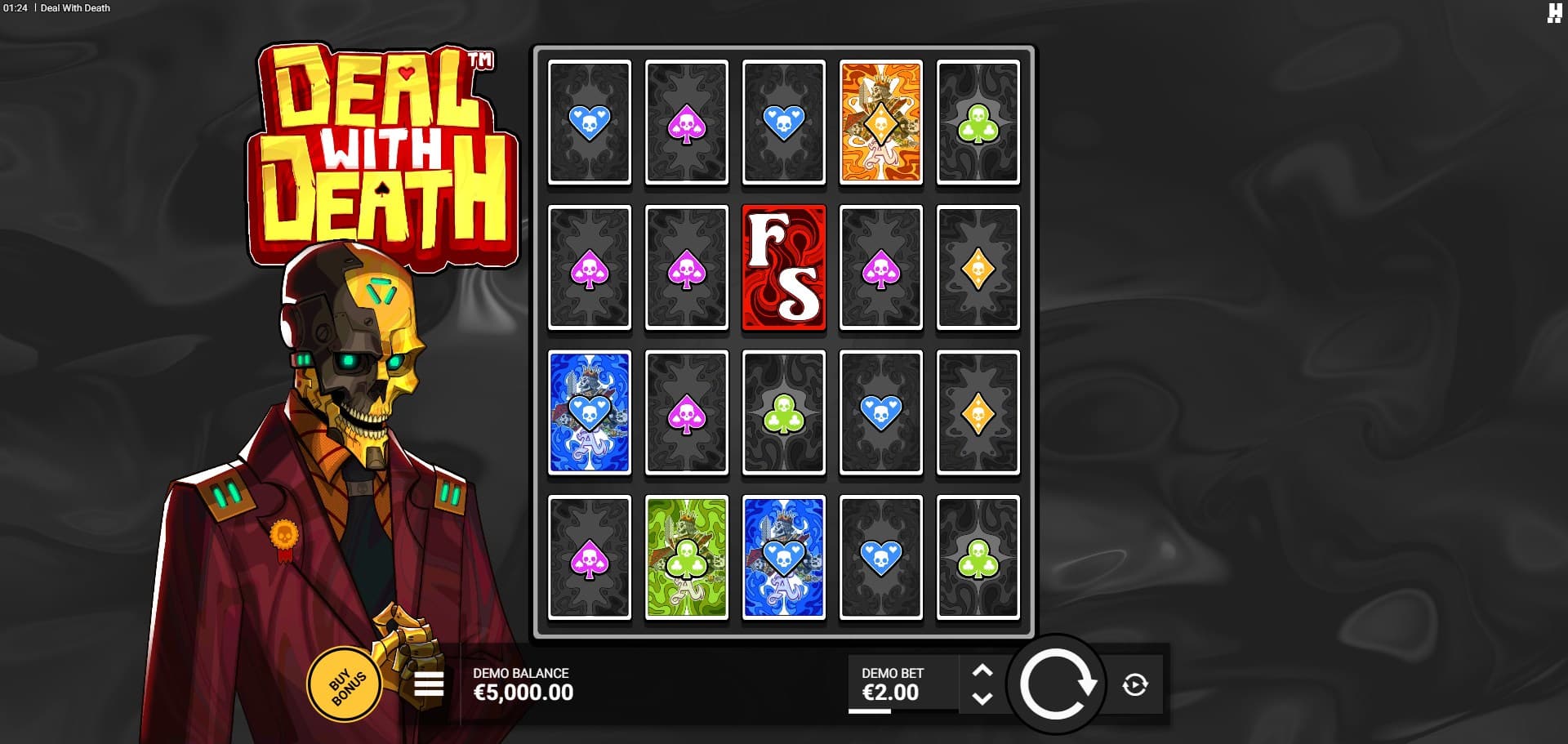 Deal With Death is a video slot developed by Hacksaw Gaming, released on 2026-01-22. The game adopts a poker-infused theme centered around a one-on-one gambling showdown with a classy, robotic skeletal figure dressed in a suit, evoking a grim yet stylish encounter in a misty purgatory-like realm. Gameplay revolves around a 5×4 grid with 14 fixed paylines, where standard slot wins combine with a unique Poker Mode triggered by Joker symbols, transforming the reels into card hands for substantial payouts. Special features include four variants of Joker Wilds with boosters, three distinct free spins bonuses that enhance the poker mechanics, and a 20,000x max win potential. This mid-high volatility title targets players who enjoy innovative hybrid mechanics blending traditional slots with poker elements, appealing to fans of high-stakes tension, strategic hand-building excitement, and Hacksaw Gaming‘s signature high-reward features. The affordable betting range from €0.10 to €50 makes it accessible for casual spinners and high rollers alike, while the default RTP 96.25% aligns with industry norms.