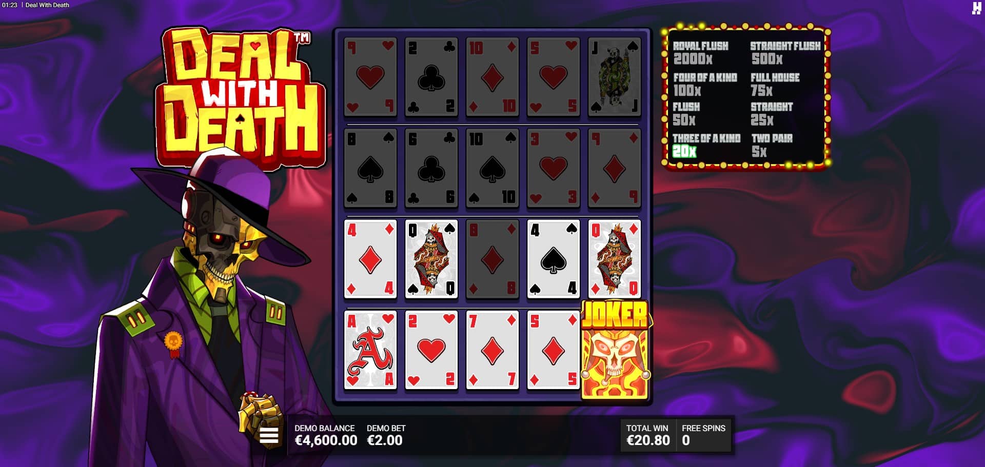 Deal With Death employs a straightforward yet innovative structure on its 5 reels and 4 rows, with 14 fixed paylines determining wins. Basic rules require 3 to 5 matching regular symbols to land on adjacent reels from left to right along any payline. The paytable splits symbols into low pays (grey suit cards: 2x-3x for 5OAK) and high pays (colored Aces: 10x-20x for 5OAK), providing modest base game rewards that encourage progression to features.