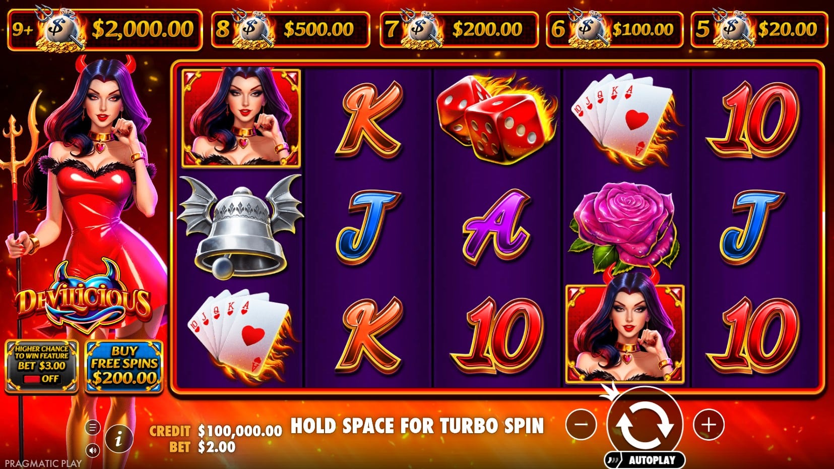 Devilicious is a video slot developed by Wild Streak Gaming, released on June 10, 2024. The game embraces a devil-themed aesthetic centered around the mischievous character Devilicious, a female figure portrayed in a playful manner amid flames and fire elements. It employs a classic setup with 5 reels, 3 rows, and 20 fixed paylines, where wins form by landing three or more matching symbols on adjacent reels from left to right. This high-volatility title targets players seeking substantial payout potential, highlighted by a maximum win of 10,000x the stake, alongside features like Money Symbols and multipliers. With a default RTP of 96.46% and a base game hit frequency of 24.33%, it appeals to enthusiasts of intense, rewarding gameplay similar to titles such as Lucky Lightning and Temujin Treasures.