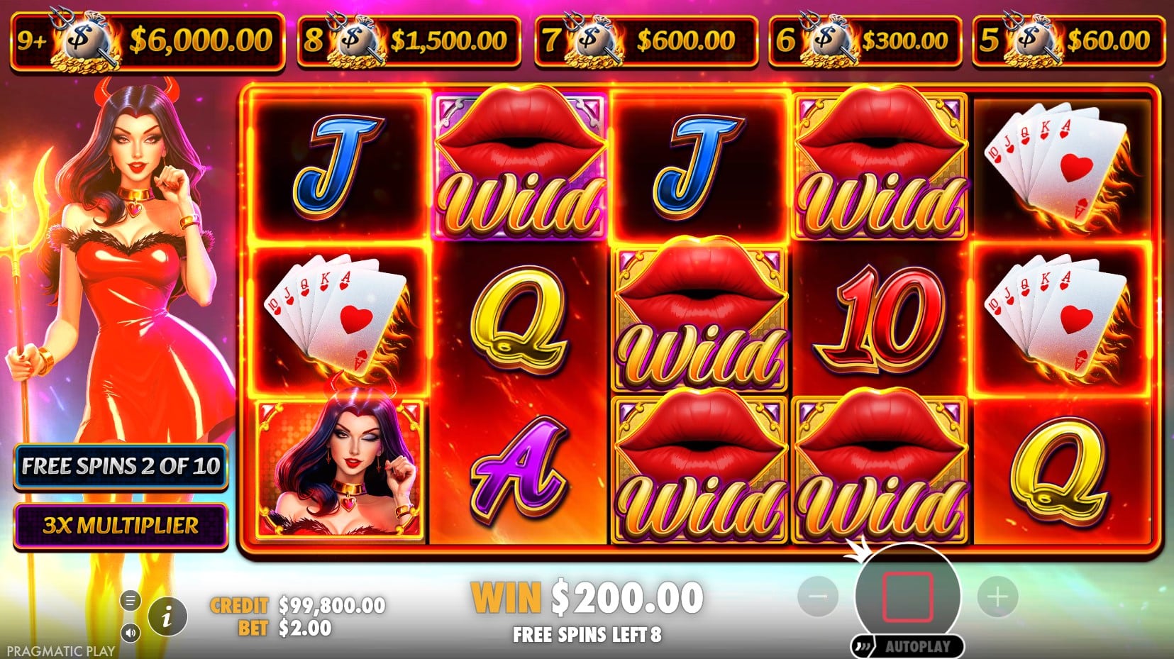 Symbols feature bold, thematic designs: low-paying icons include stylized 9, 10, J, Q, K, and A in a crimson hue, while premium symbols comprise red dice, playing cards, a pink rose, a silver bell, and the Devilicious portrait, which offers the highest payout. The Wild Symbol appears as red lips emblazoned with “Wild” text, the Scatter Symbol as a glowing blue heart, and the Money Symbol as a golden money bag that can manifest in single, double, or triple heights. Animations are smooth and engaging—winning combinations trigger fiery explosions, respins feature locking effects with dramatic pauses, and the Free Spins wheel spins with flair, accompanied by particle effects.