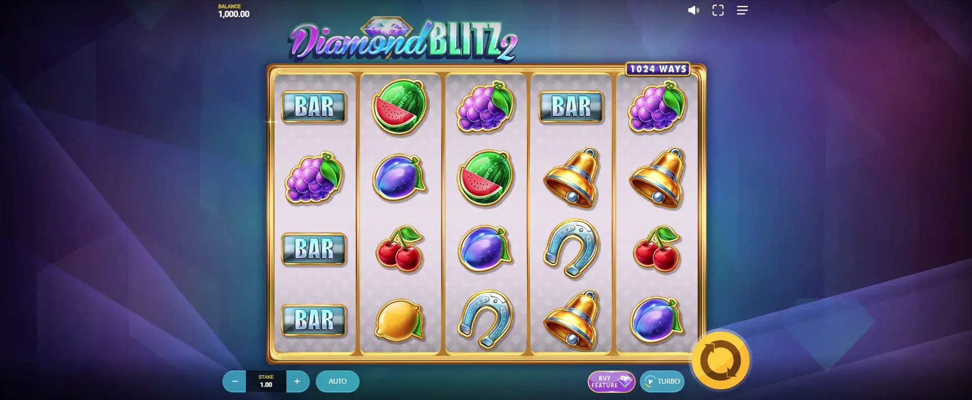 Symbols include familiar icons like cherries, lemons, plums, grapes, watermelons, bells, BARs, horseshoes, and 7s in gold and purple variants. These are all rendered with crisp graphics and soft glow effects. While it doesn’t break new ground visually, Diamond Blitz 2 polishes its traditional slot theme well and keeps the focus where it matters—on the action in the reels.