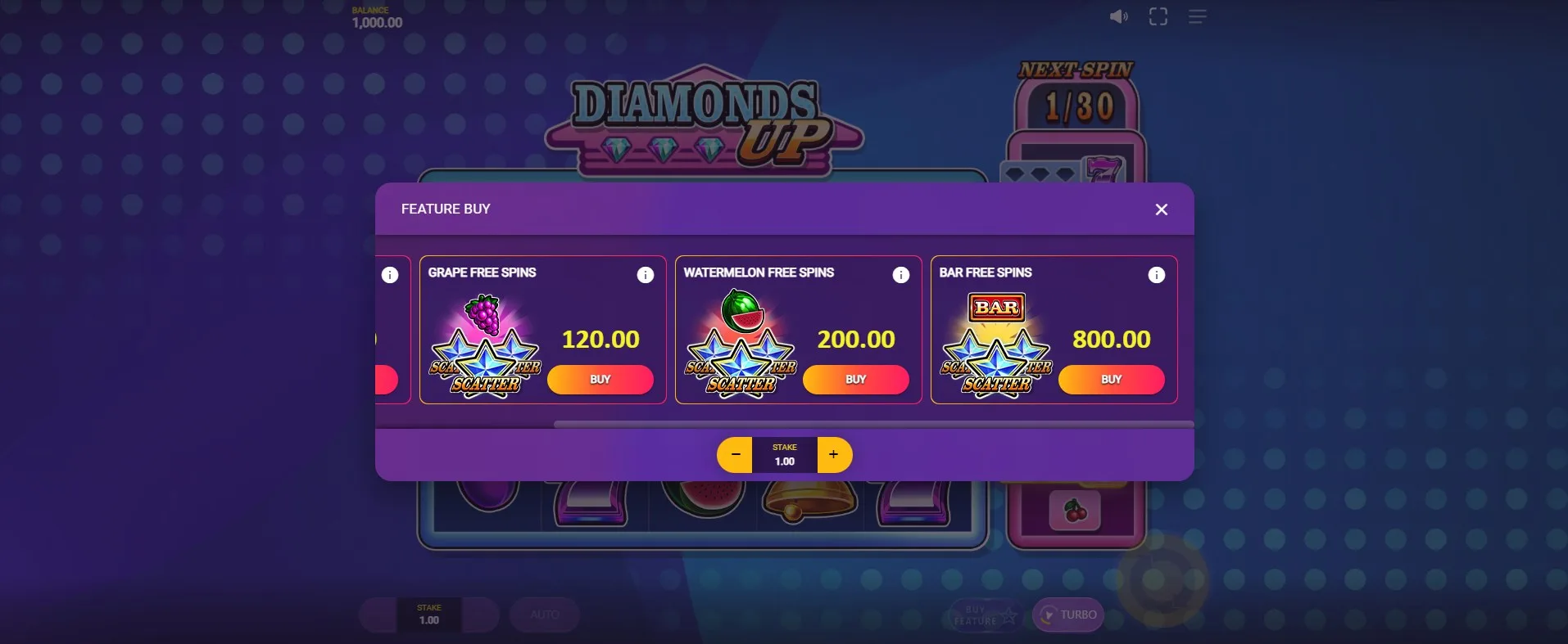 Rare for a Red Tiger slot, Diamonds Up offers a Feature Buy menu:Players can buy their way into free spins at five price points depending on how many ladder levels are filled: