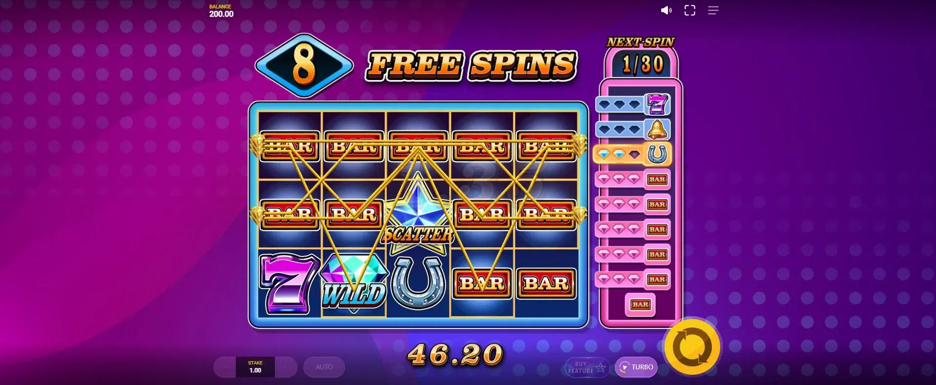 During the free spins mode, the background switches to a vibrant pink-purple theme, and the visuals receive a small bump in energy. But overall, Diamonds Up keeps things simple, clearly prioritizing function and familiarity over cutting-edge aesthetics.