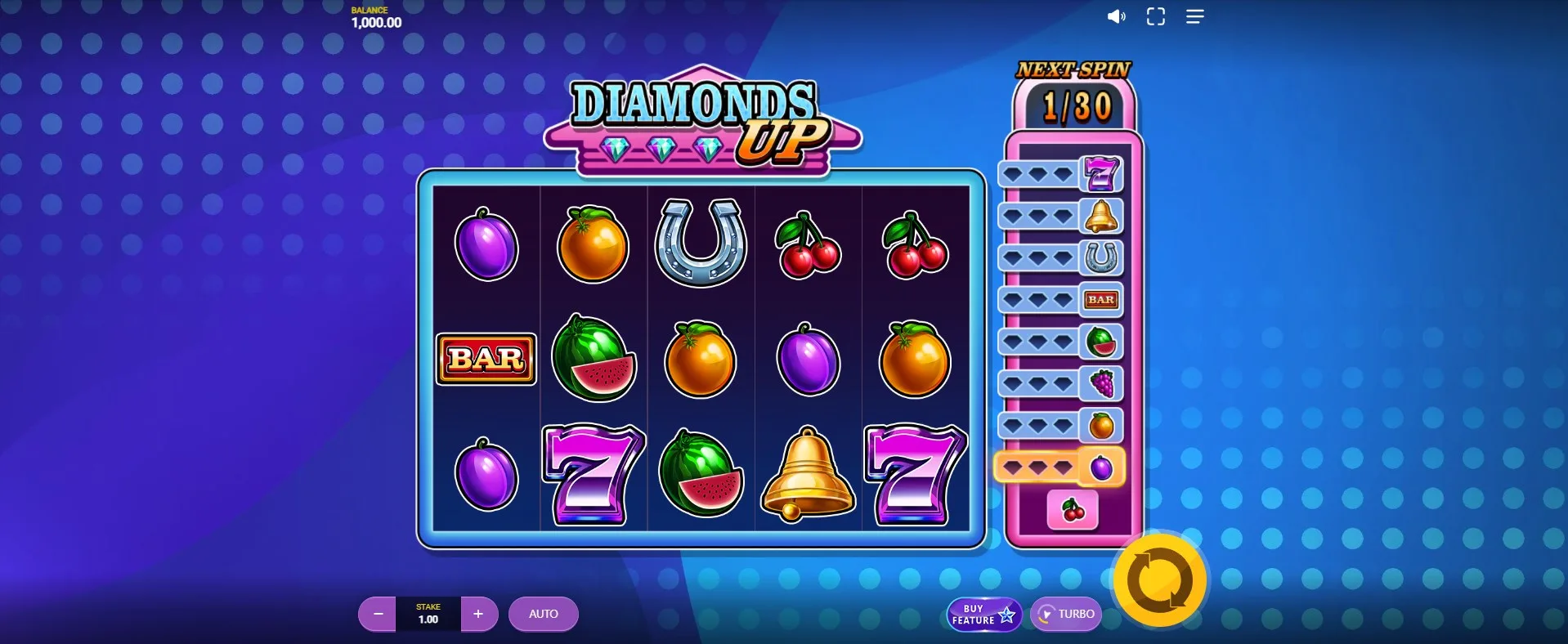 Diamonds Up leans heavily on old-school visuals, offering a bright and cheerful—but undeniably generic—look. Set against a blue-to-purple gradient background, the game sports familiar symbols like cherries, plums, oranges, bells, watermelons, BARs, and 7s, all presented with a glossy sheen. There’s also a classic diamond-shaped Wild and a blue Scatter gem, which fits the retro vibe while teasing modern features.A significant visual element is the upgrade ladder displayed to the right of the reels. It tracks progress across 30 spins and indicates which symbols are due for upgrades—a clever way to give the player visual feedback and a sense of progression.