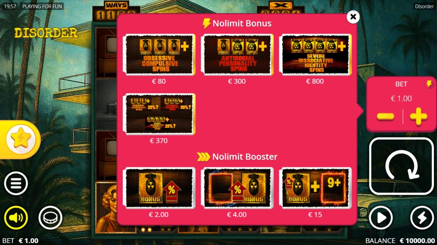Disorder excels in its immersive, evolving narrative and visual design, with symbol transformations and atmospheric effects delivering a uniquely chilling experience. Strengths include diverse Enhancer Cells modifiers, tiered Free Spins with customizable persistence, and seamless integration of Nolimit City staples like xBombs and splits for varied, high-potential gameplay. The Extra Spin, Nolimit Booster, and Feature Buy add strategic depth. Weaknesses encompass a less extreme max win compared to some peers and reliance on random Fire Frames for peak excitement, potentially frustrating shorter sessions amid high volatility. Players can test the slot risk-free using the built-in demo available on this page. Overall, Disorder stands as a compelling, technically robust entry for dark-themed slot enthusiasts, balancing terror with rewarding mechanics.