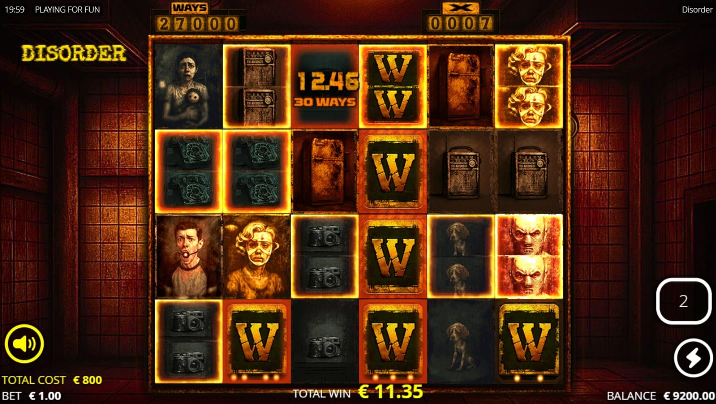 Disorder employs a 6-reel grid with rows configured as 4-3-4-3-4-3, yielding 1,728 ways to win through connected symbols landing on adjacent reels from left to right, requiring at least three matches for payouts. The base game flows with standard spins punctuated by random Fire Frames, where positions ignite in flames at spin start. Symbols within Fire Frames split into two halves, doubling their presence, while any Bonus Symbol upgrades to a Super Bonus Symbol. Beneath reels 2, 4, and 6 lie Enhancer Cells, initially inactive but activated by Fire Frames: 4 frames open the cell under reel 2, 7 open reels 2 and 4, and 9 open all three. Every two additional Fire Frames beyond nine reactivate all cells. Each activated Enhancer Cell reveals one of six modifiers: